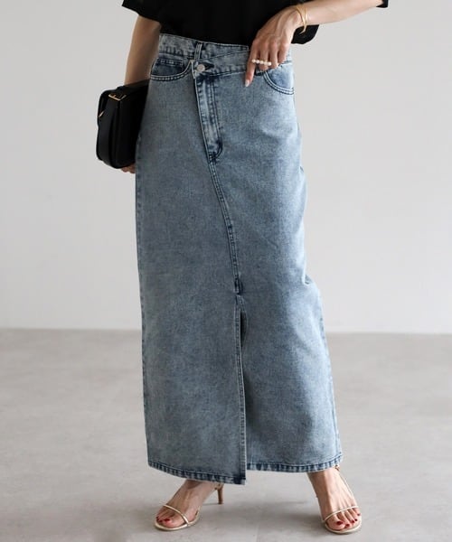 こなれ感のあるスタイリングが1枚で完成する、クロスウエストデザインのデニムスカート。