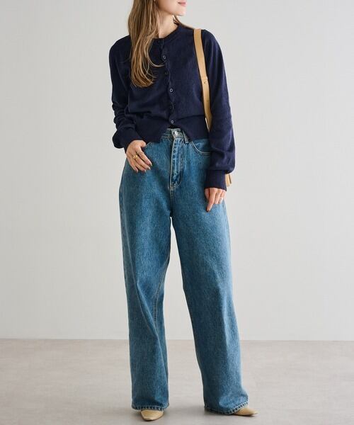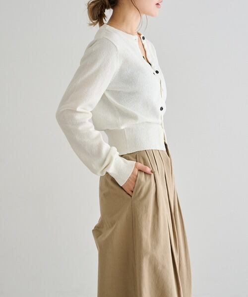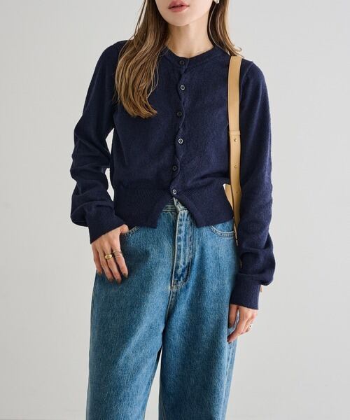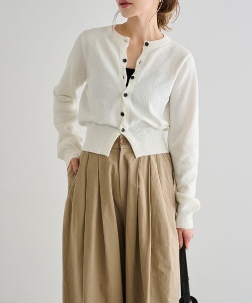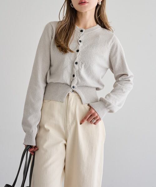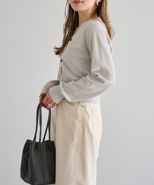 さりげなく差がつく クロスボタンの表情ニットカーデ。