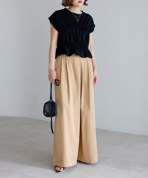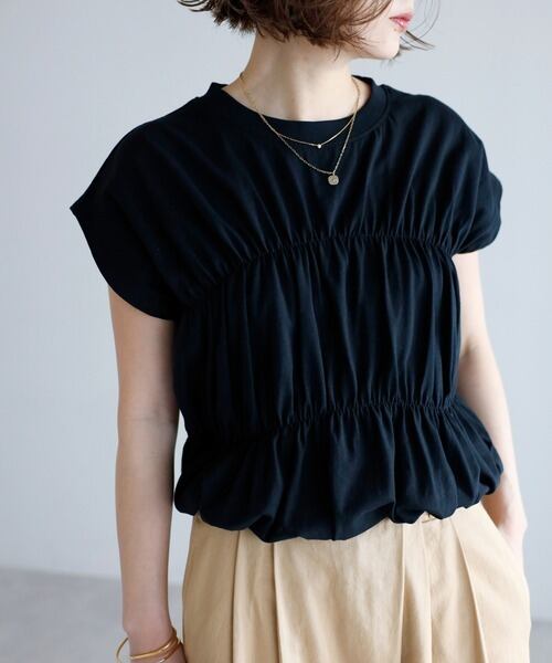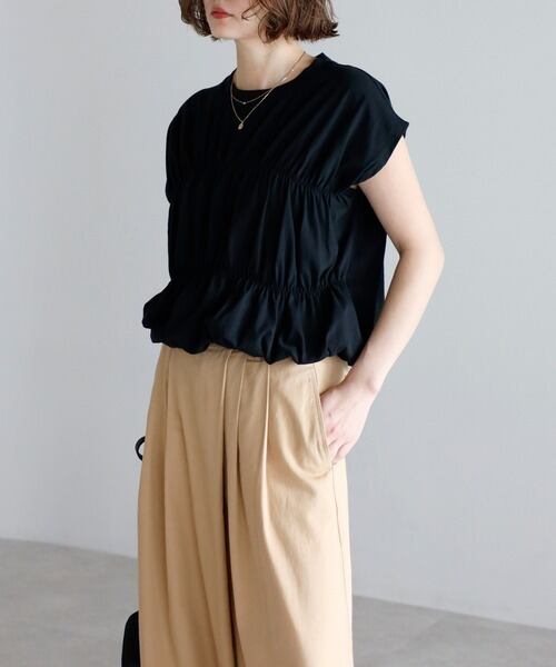 一枚で決まるギャザー切替フレンチスリーブトップス