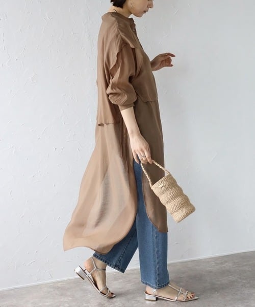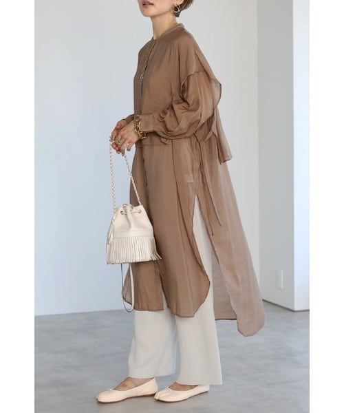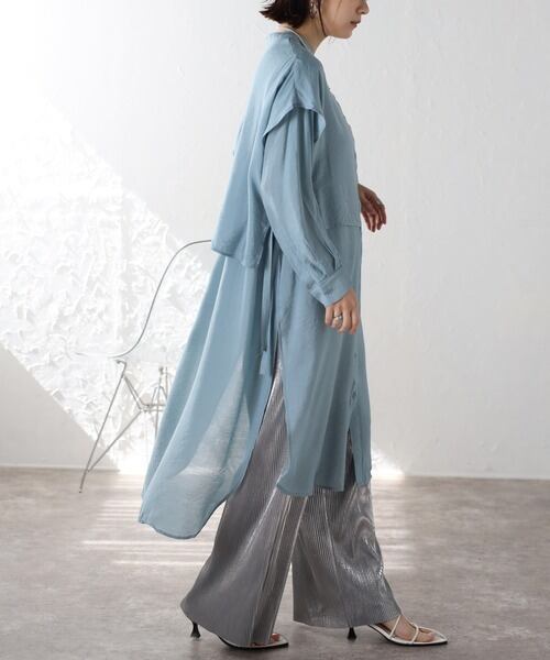 透け過ぎないシアー素材が着やすく、光沢感が上品な印象を◎