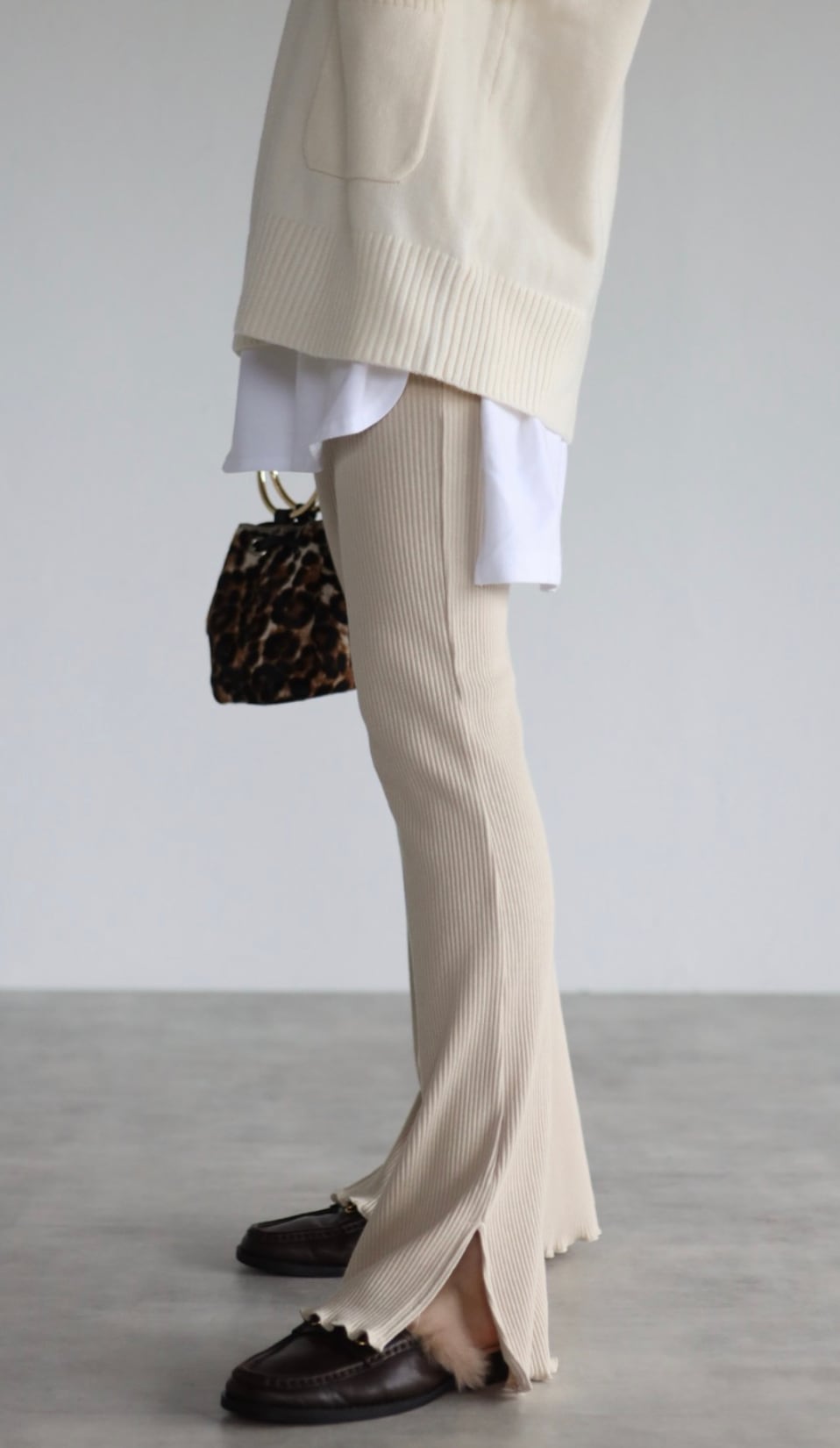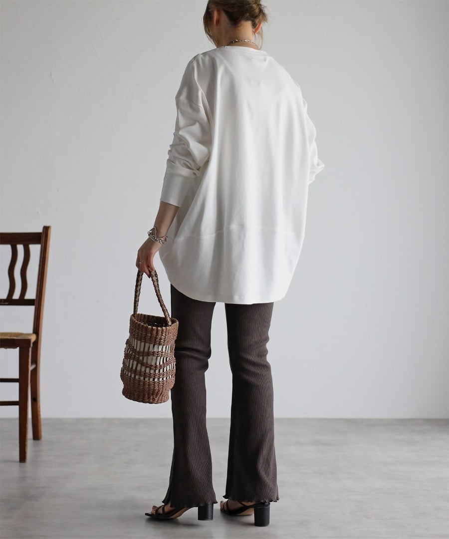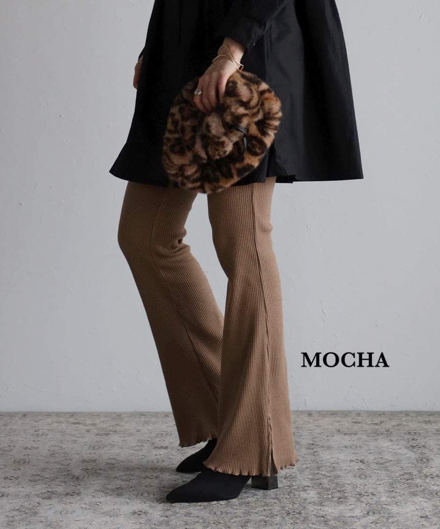 裾に向かって広がるフレアのシルエットに脚長効果も期待でき、サイドスリットが着こなしに抜け感を与えてくれるリブレギンス。