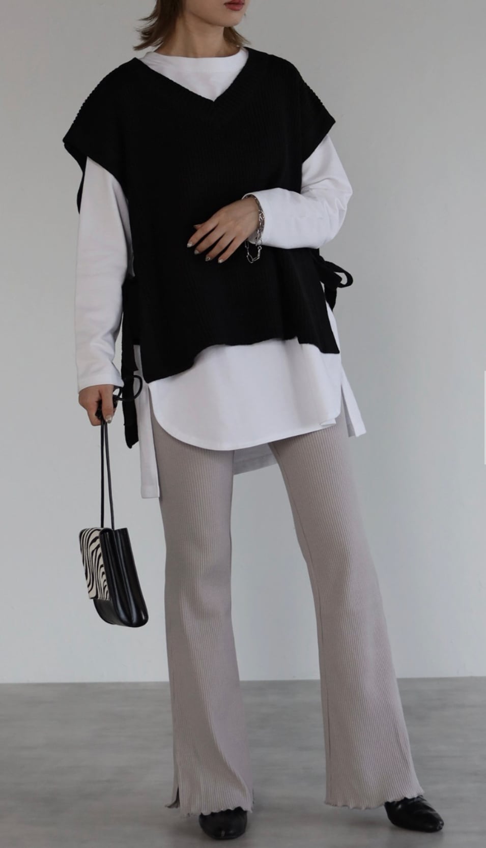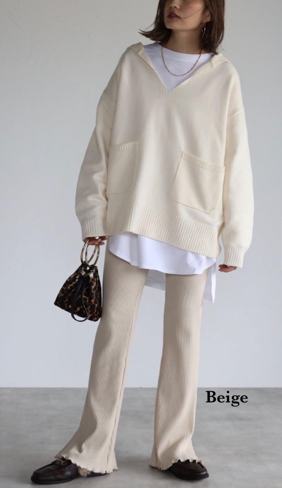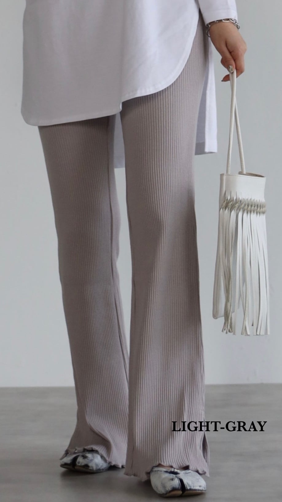 裾に向かって広がるフレアのシルエットに脚長効果も期待でき、サイドスリットが着こなしに抜け感を与えてくれるリブレギンス。