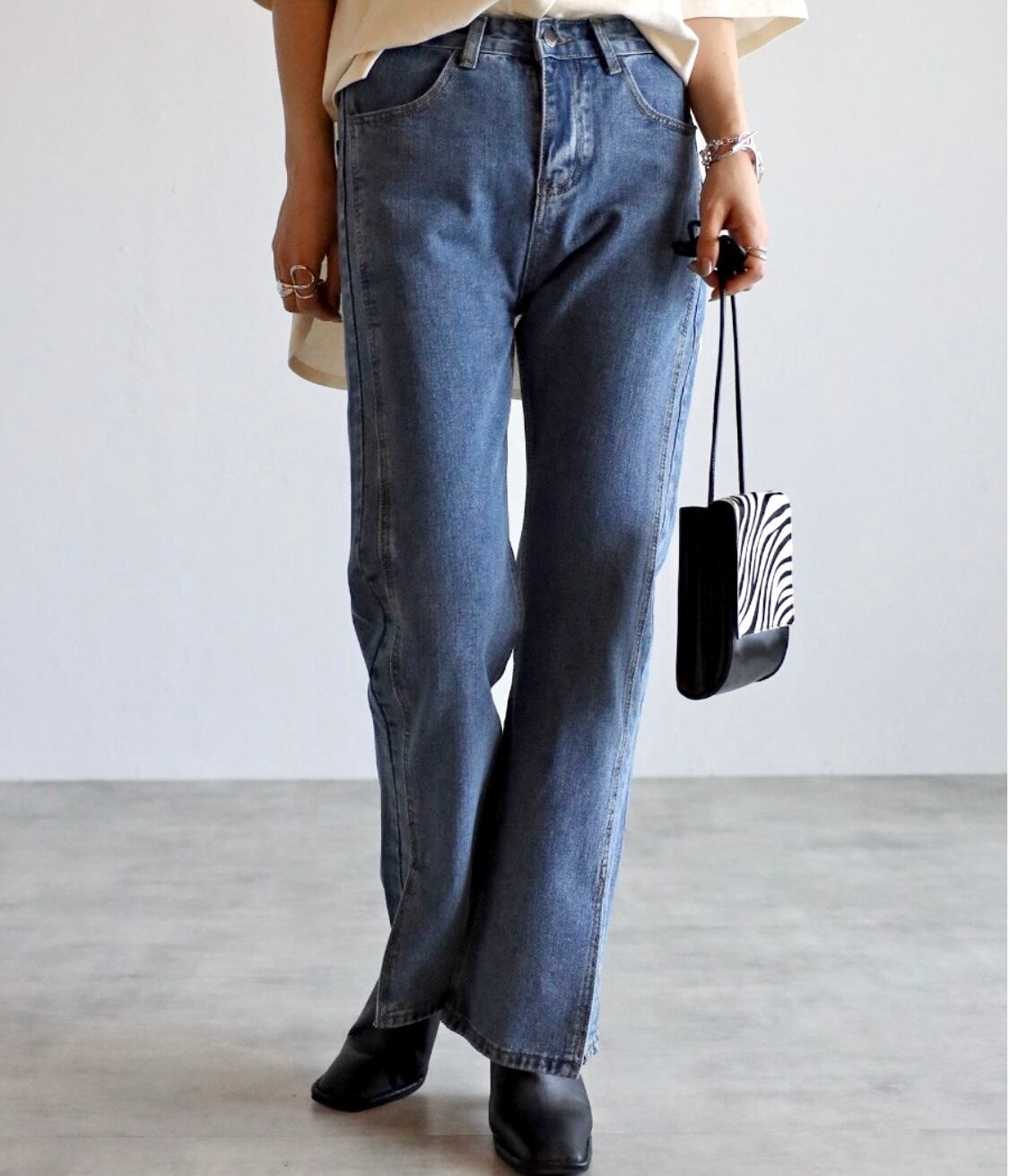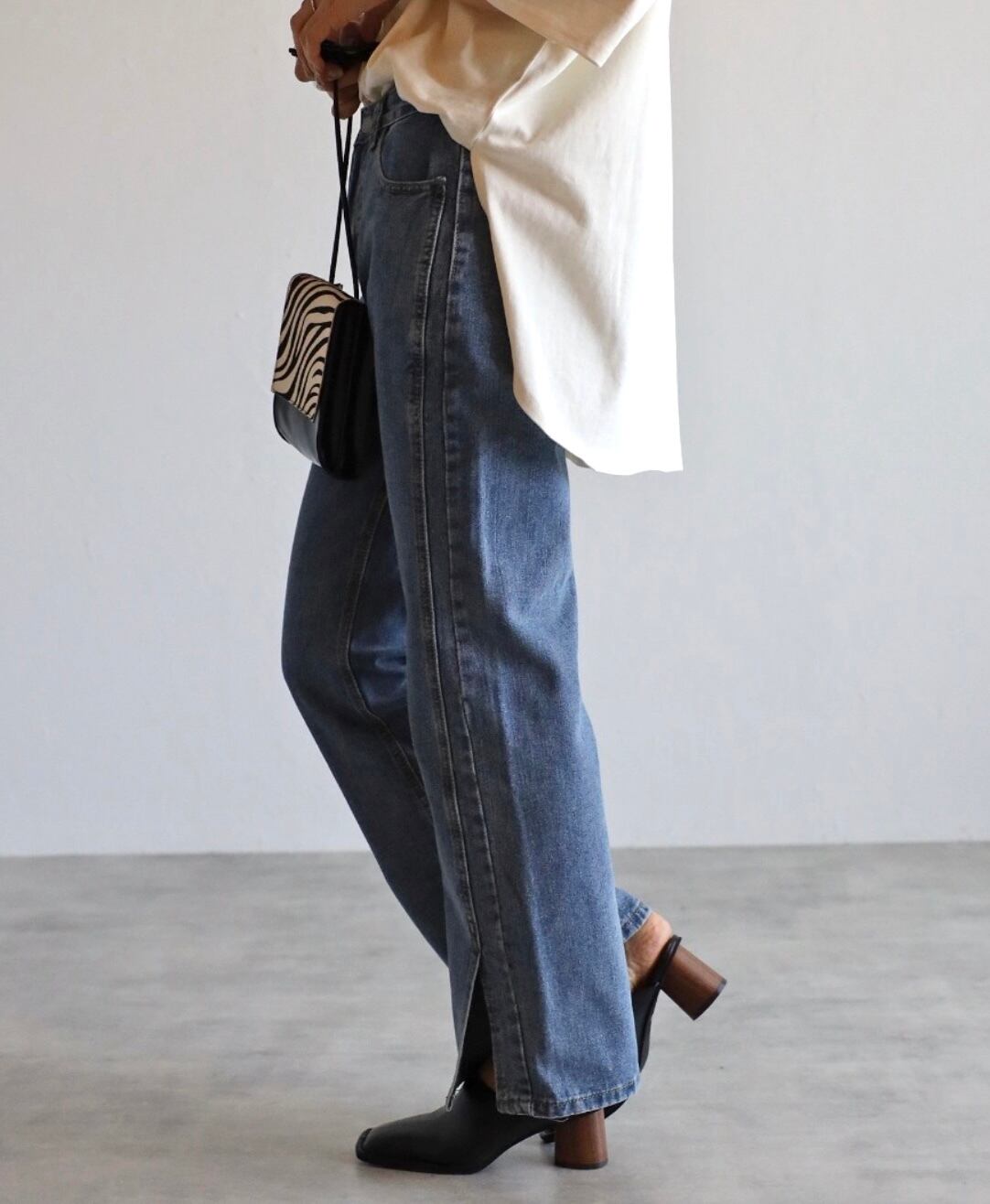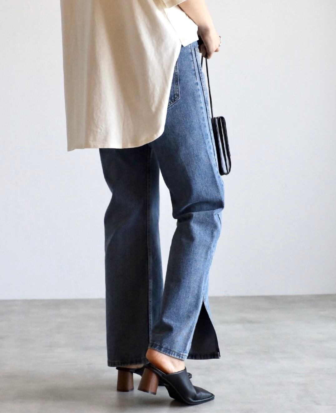弱ケミカルな加工感も◎脚長効果バッチリの裾スリットデニムパンツ