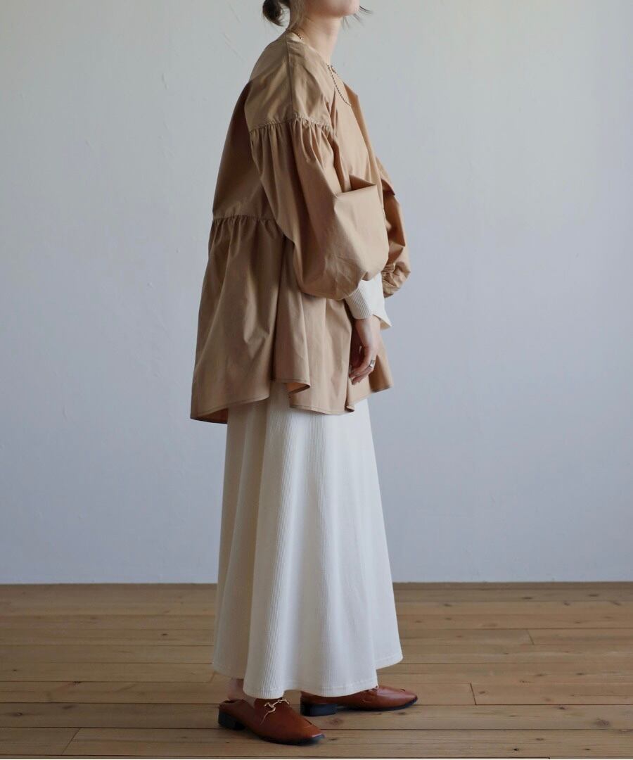 ハリ感のある生地と程良いボリュームで大人可愛い印象を与えてくれます。