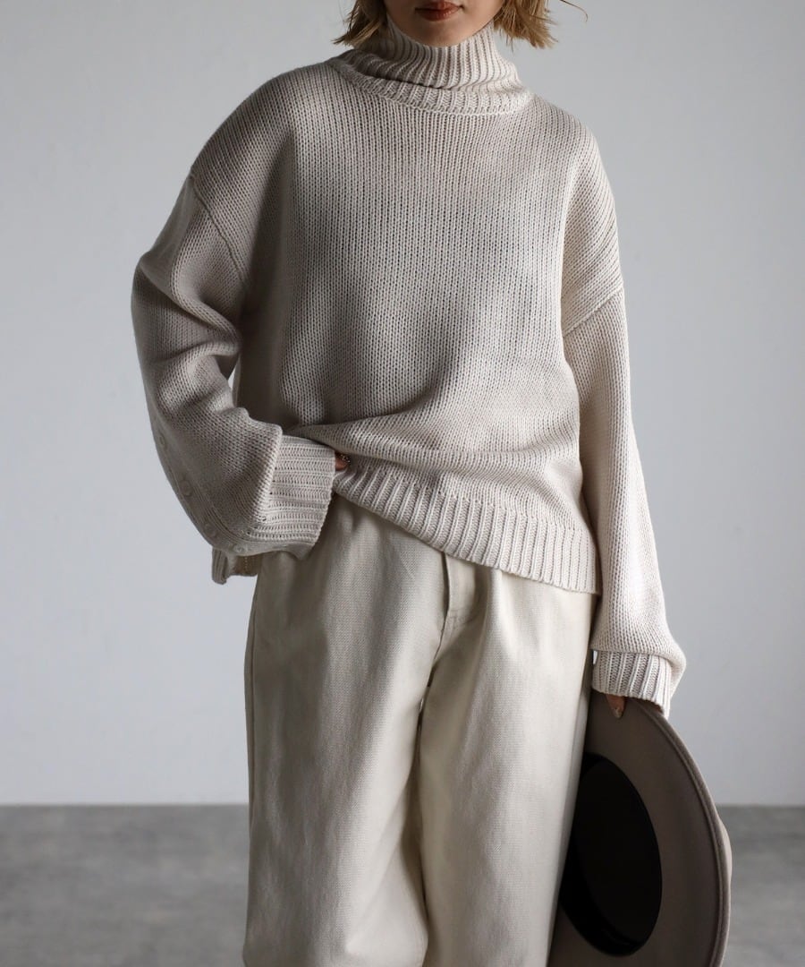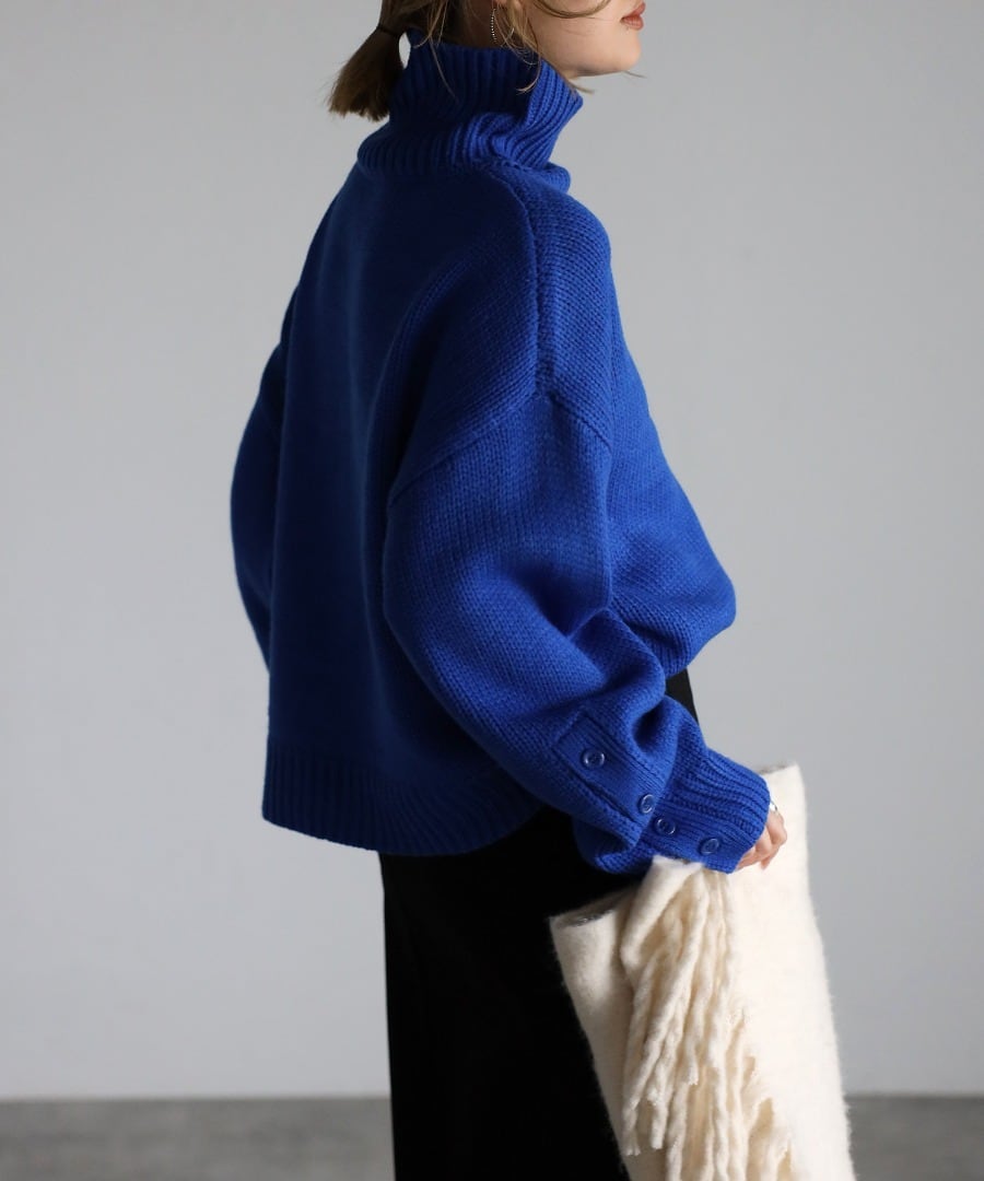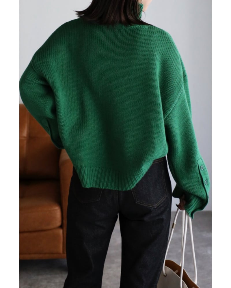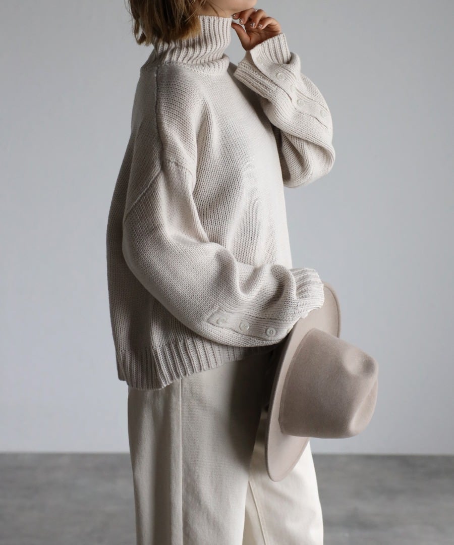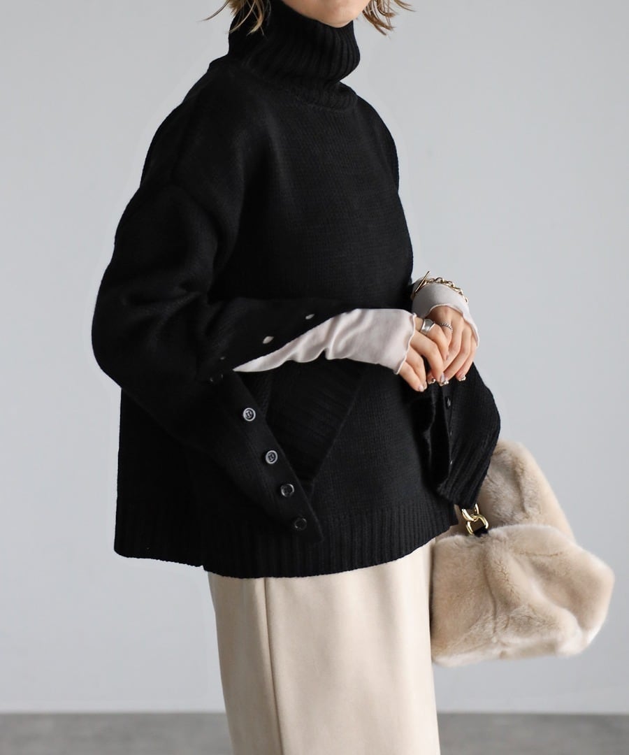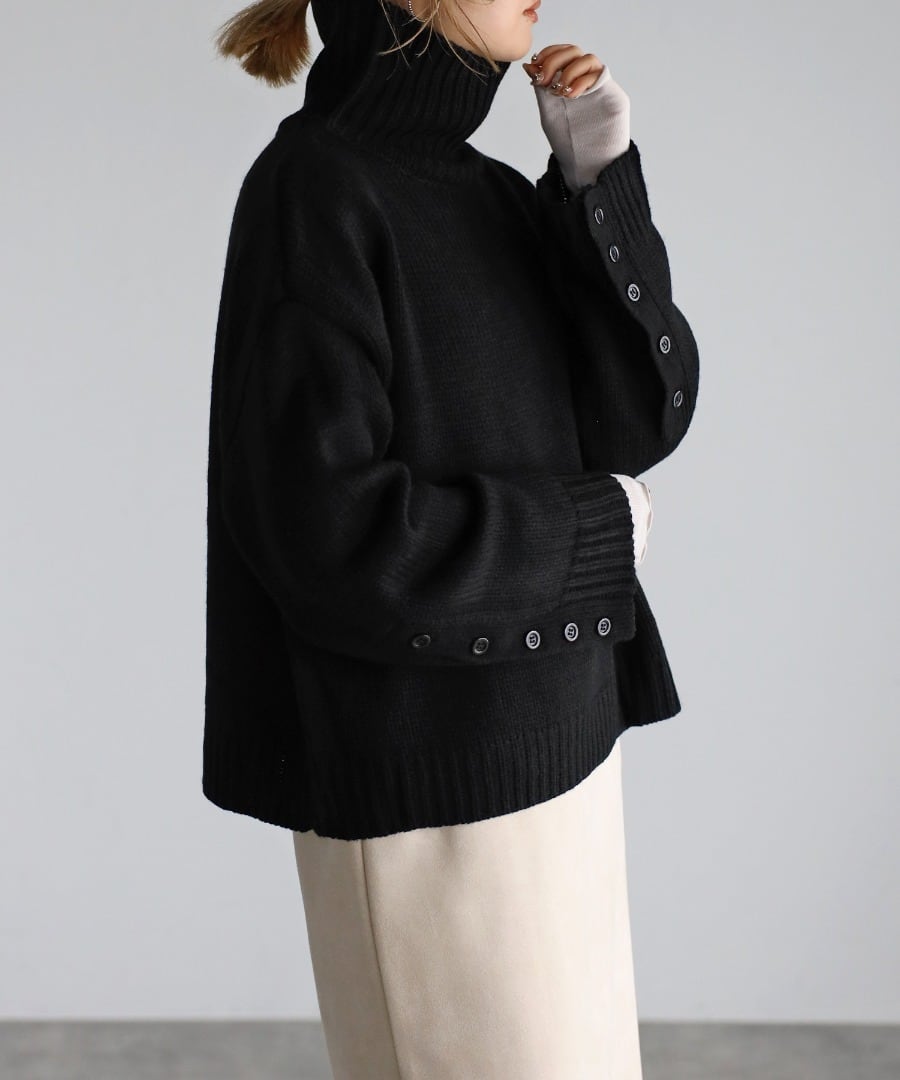 袖ボタン開きタートルネックニット