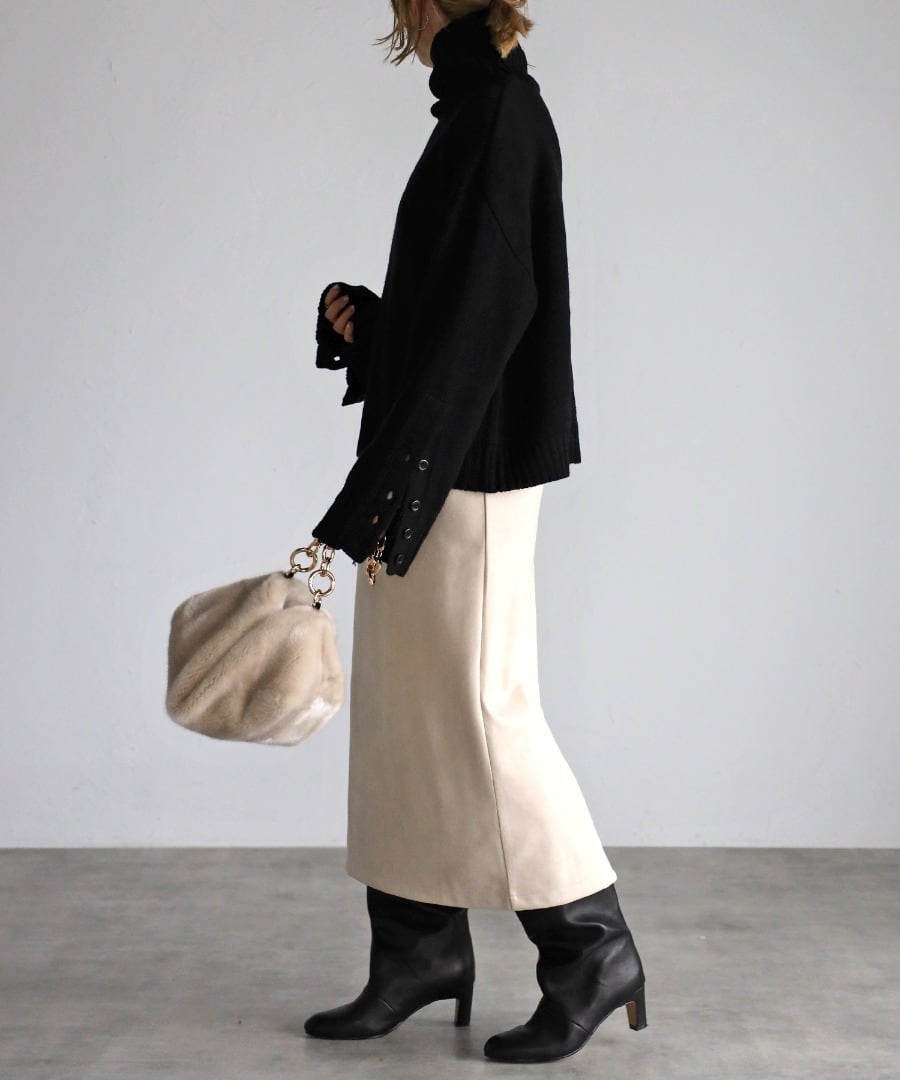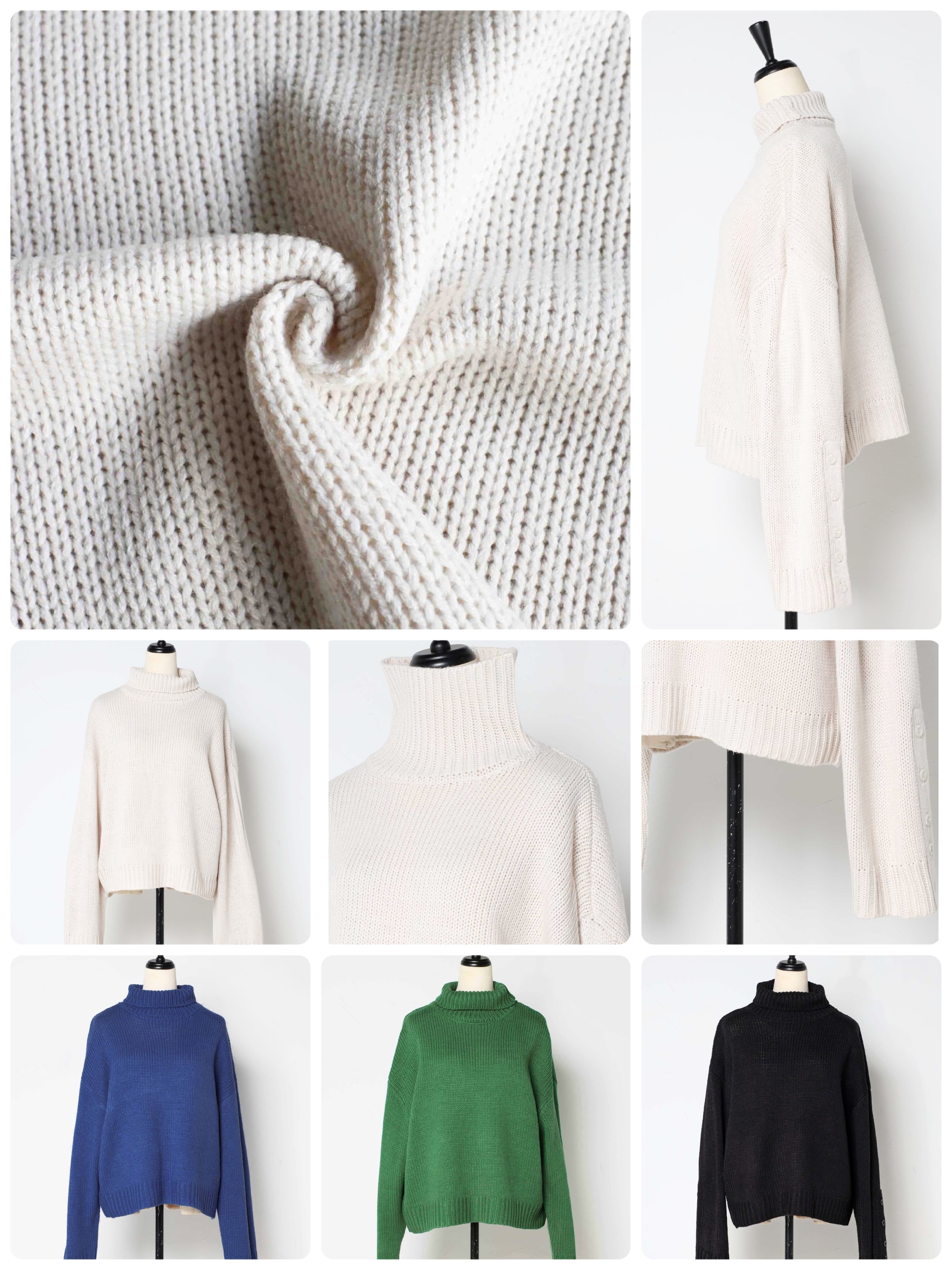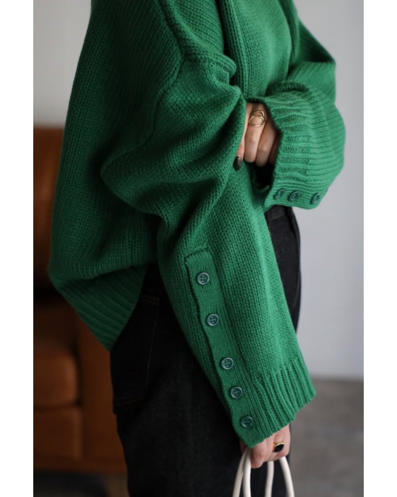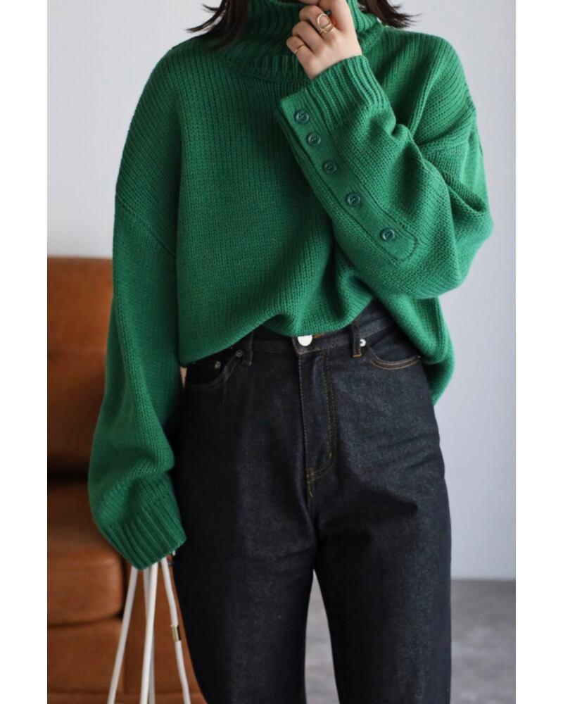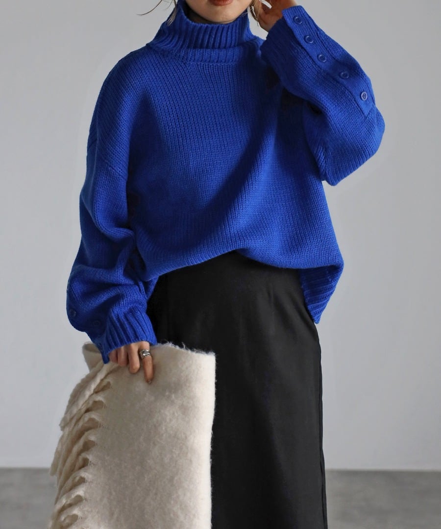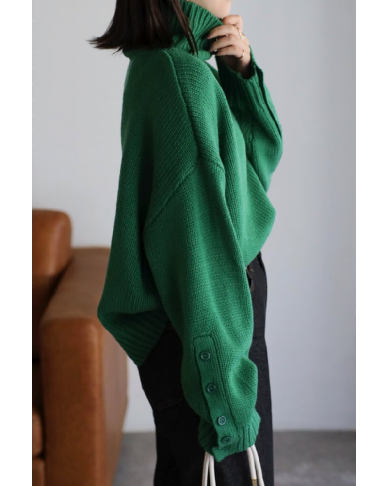 袖ボタン開きタートルネックニット