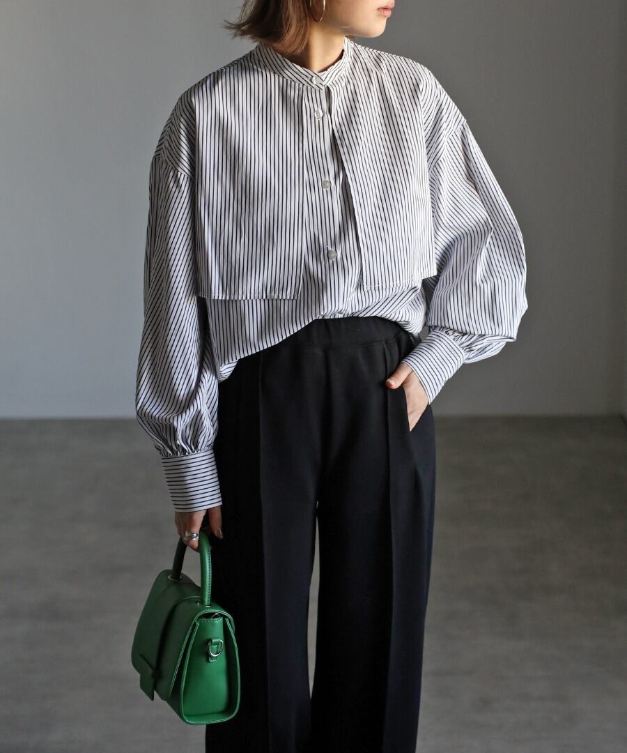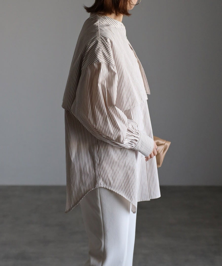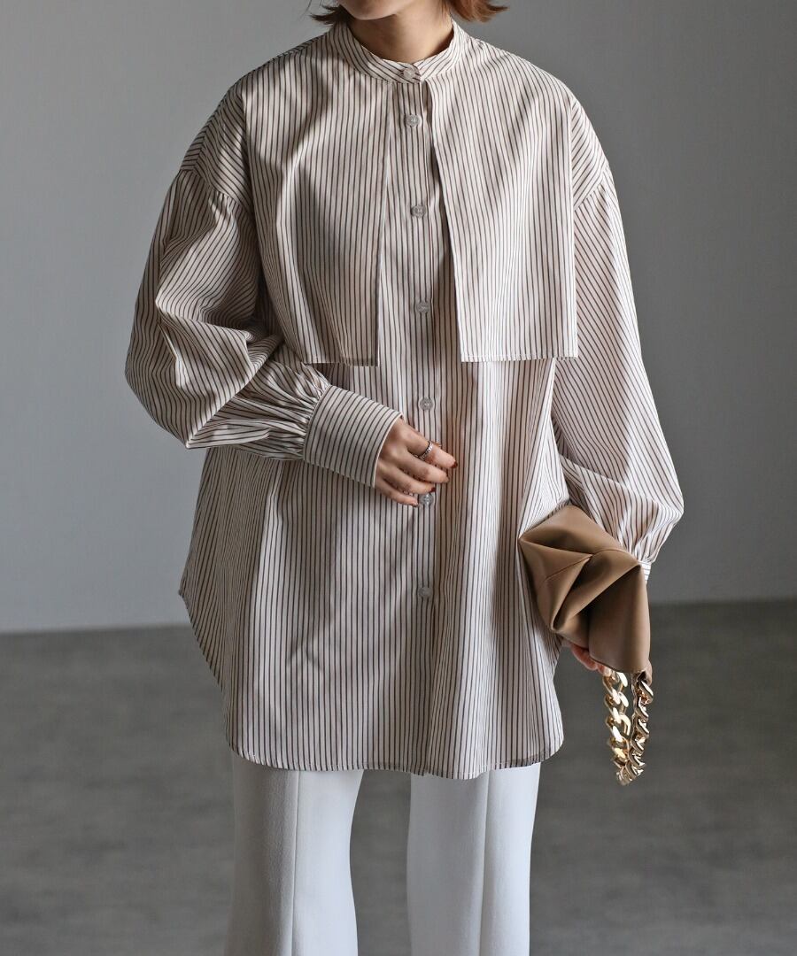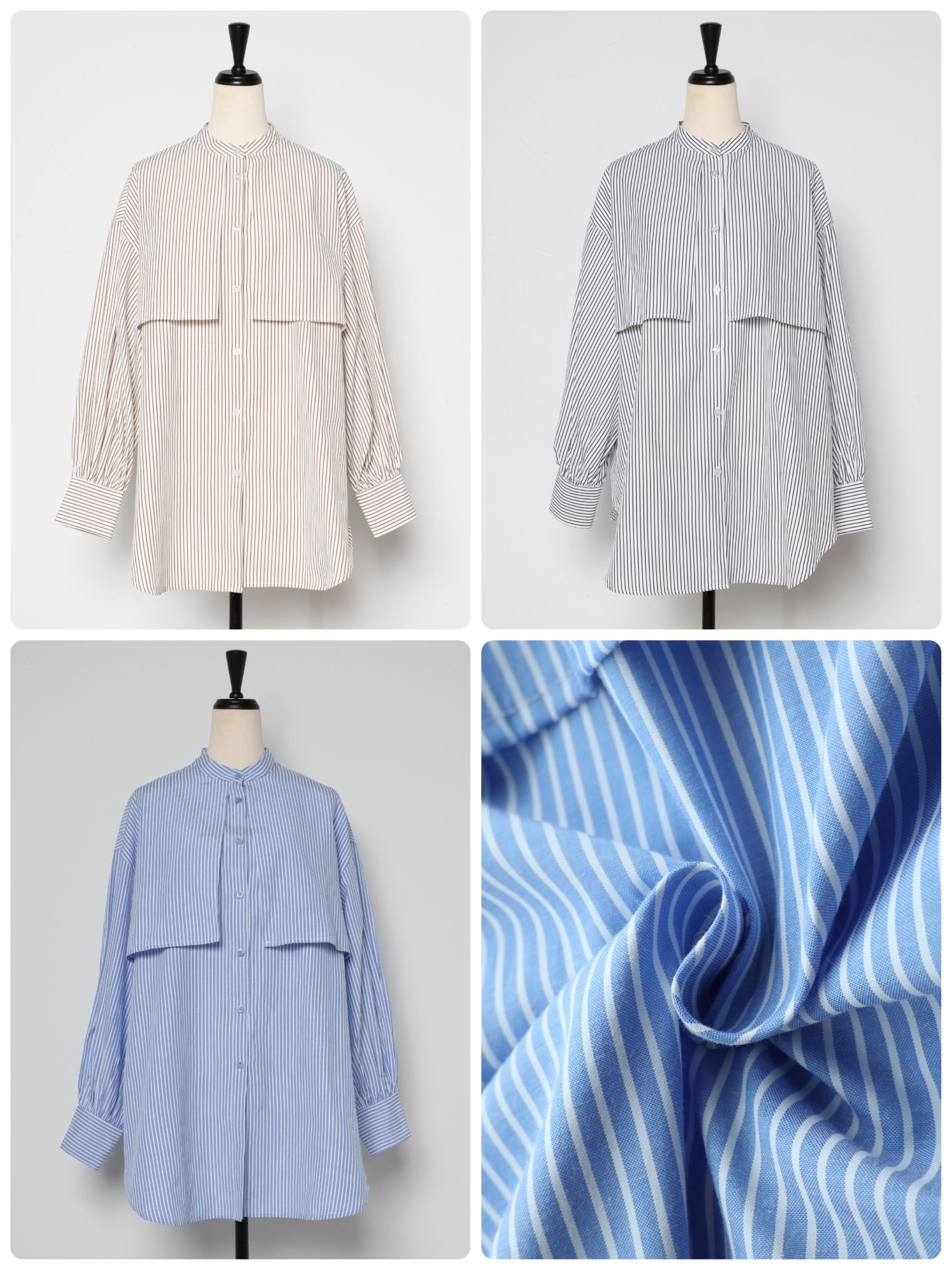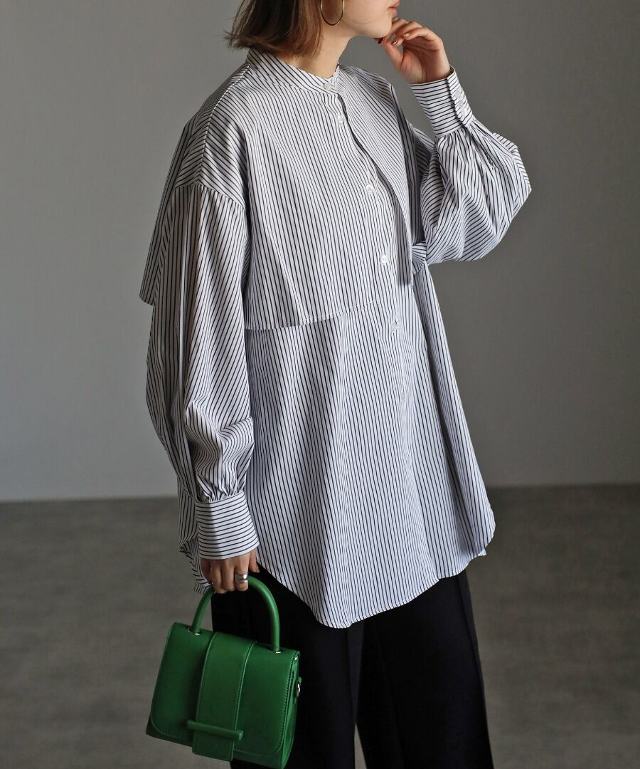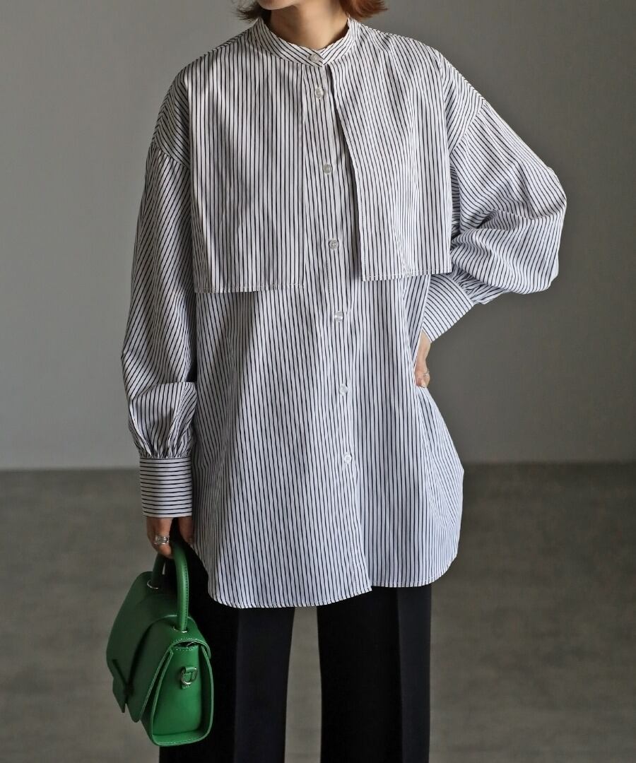 爽やかな印象のストライプ柄とバンドカラーデザインは、オールシーズンご着用していただけます。
