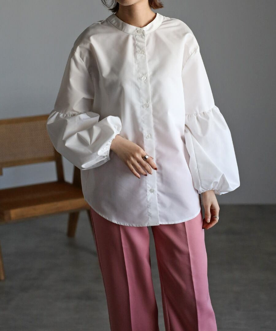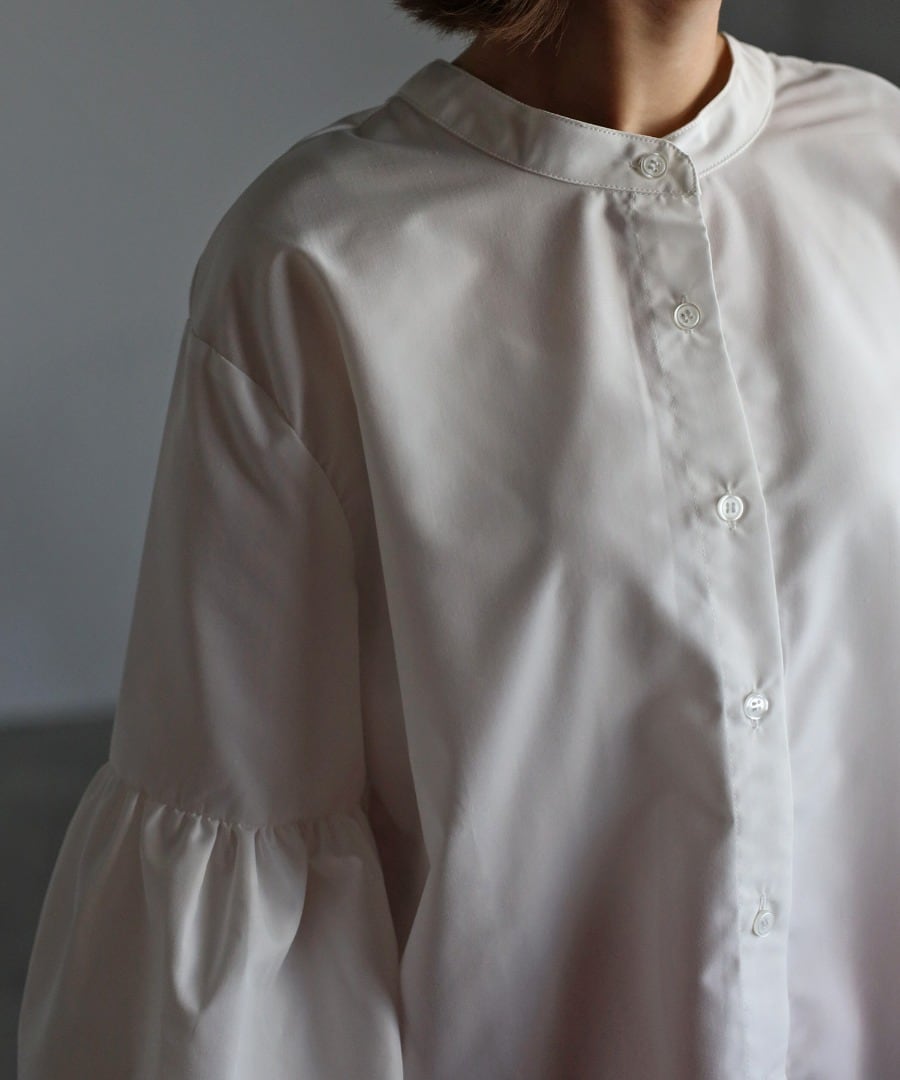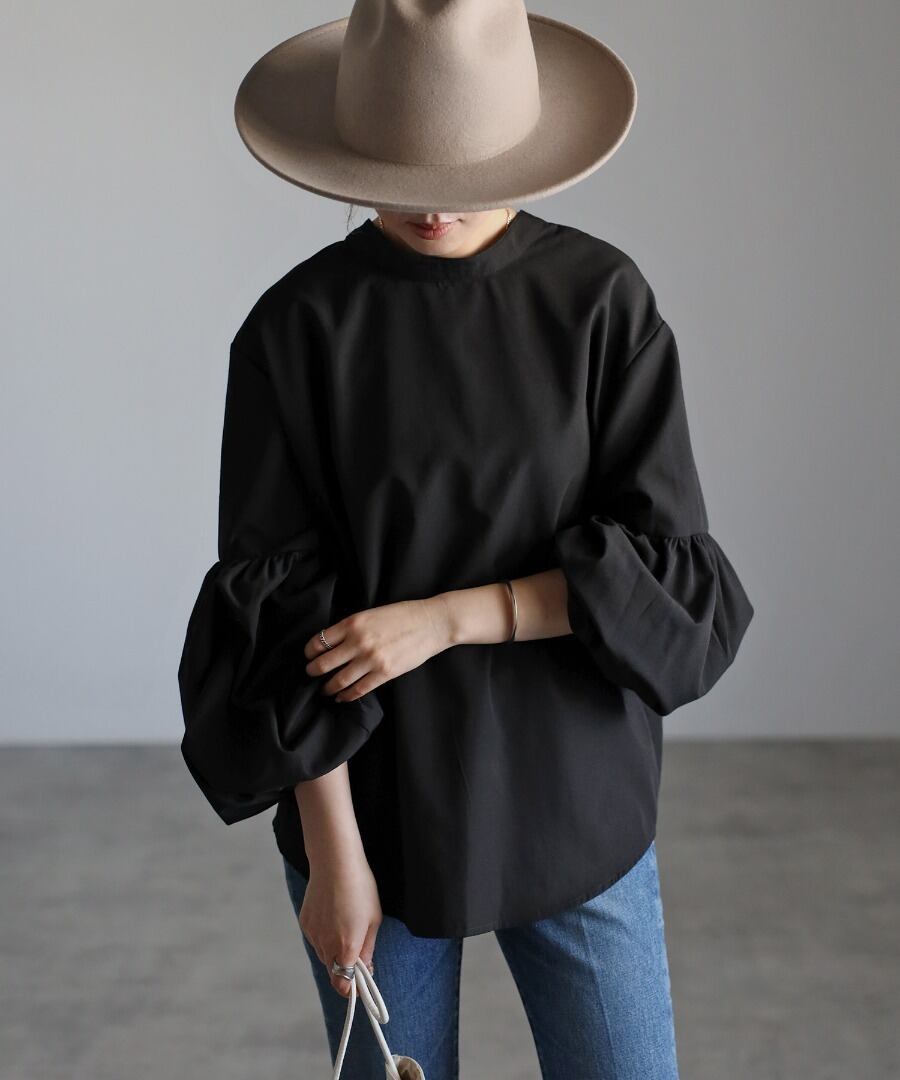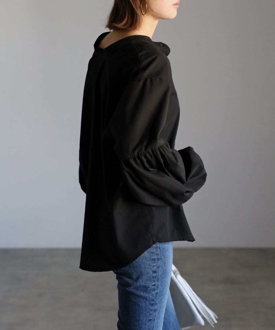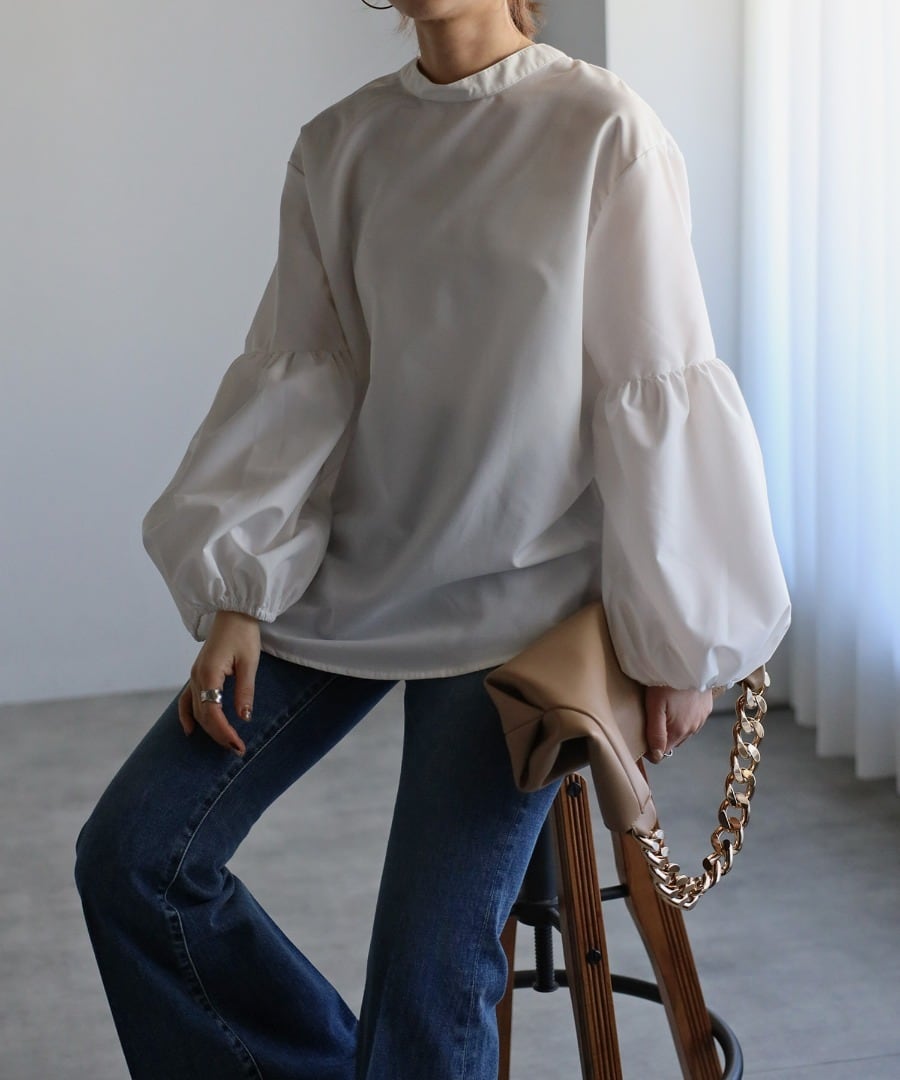 ボリュームのある袖切り替えのパフギャザーが印象的なブラウス。