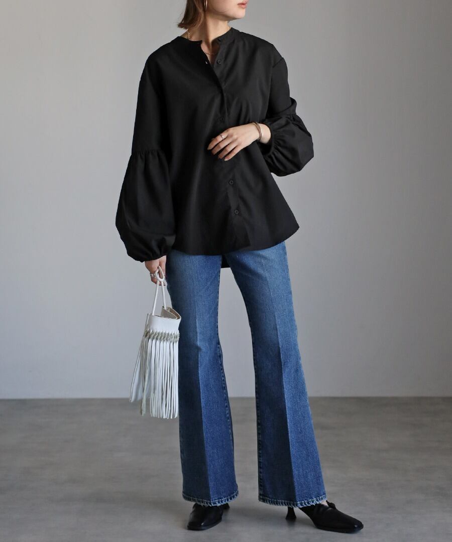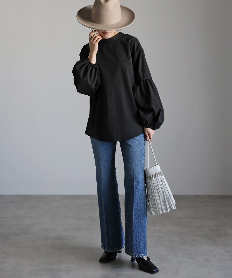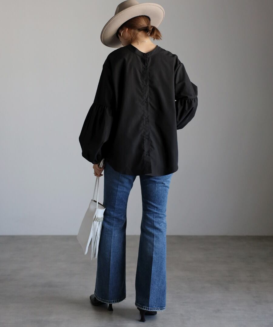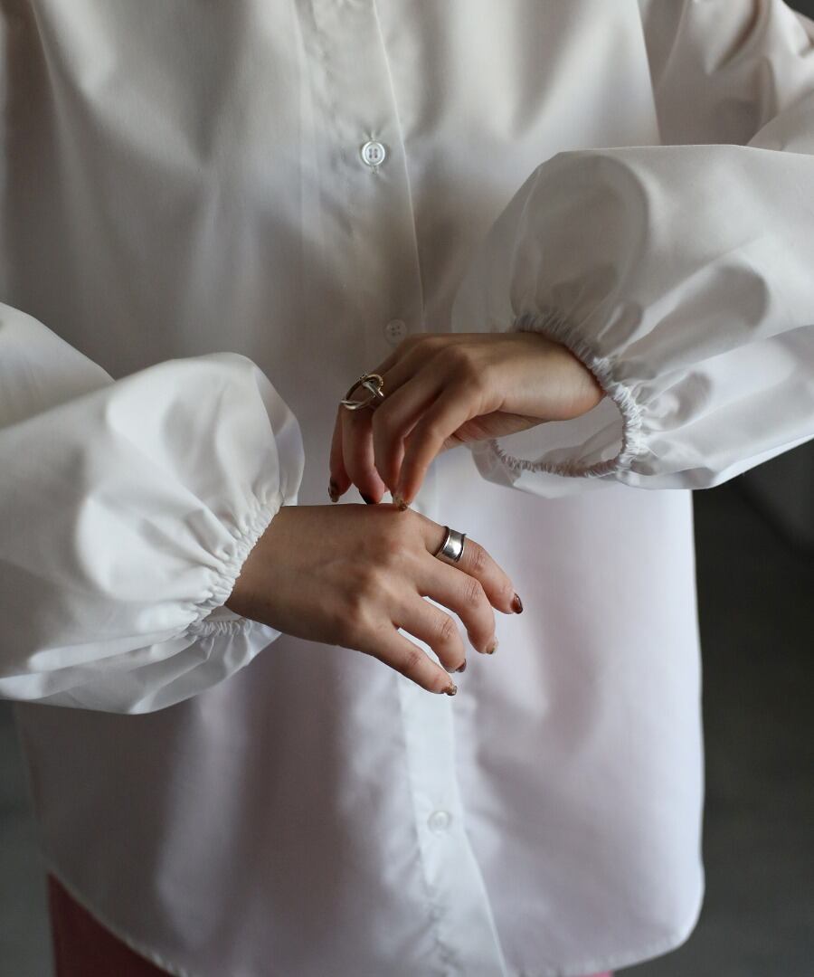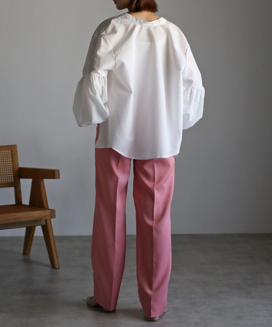 ボリュームのある袖切り替えのパフギャザーが印象的なブラウス。