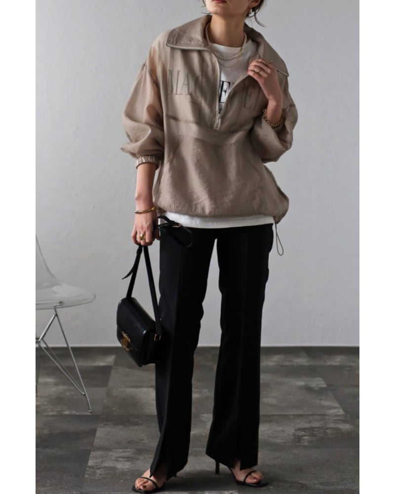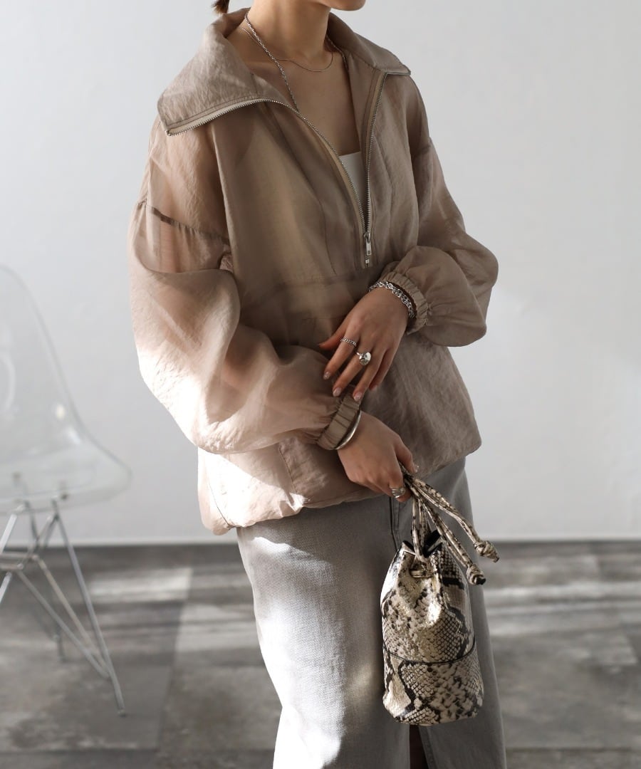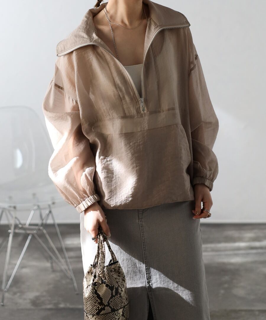 トレンドのアノラックプルオーバーのデザインに、キレイめに着られるシアー素材が登場。