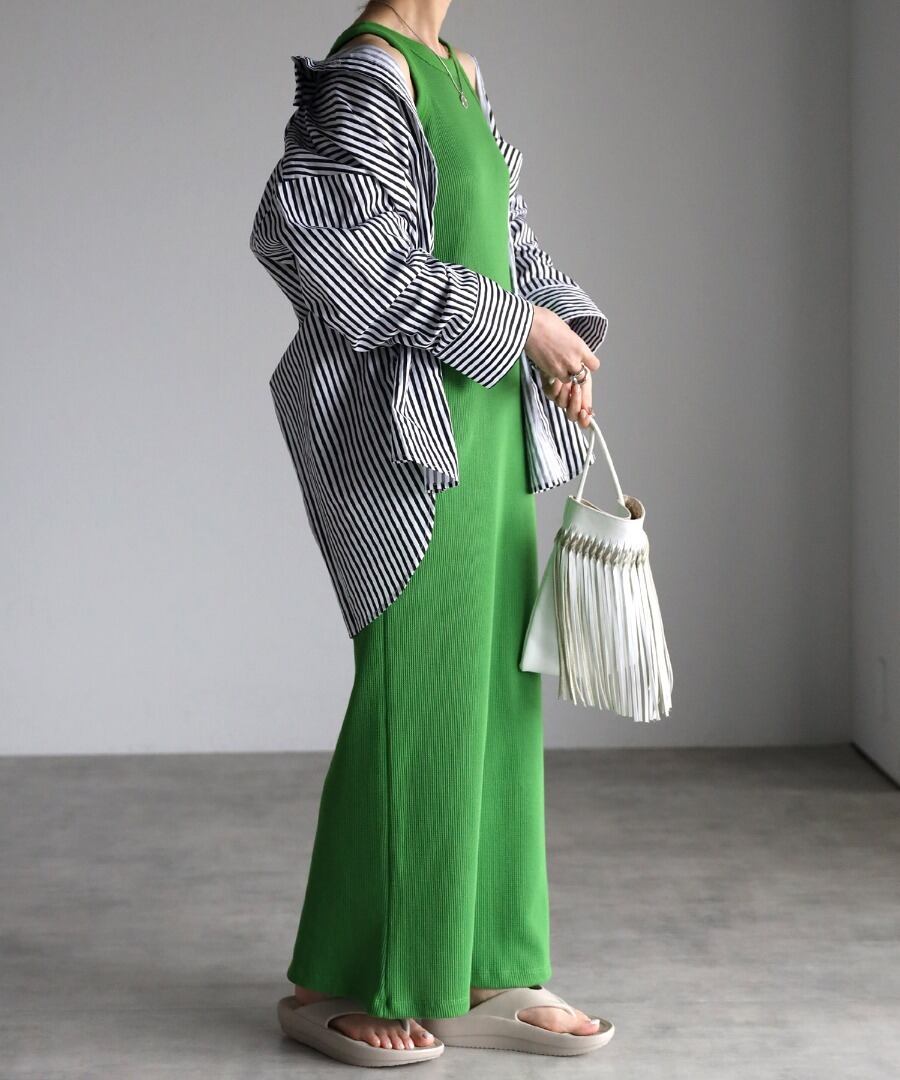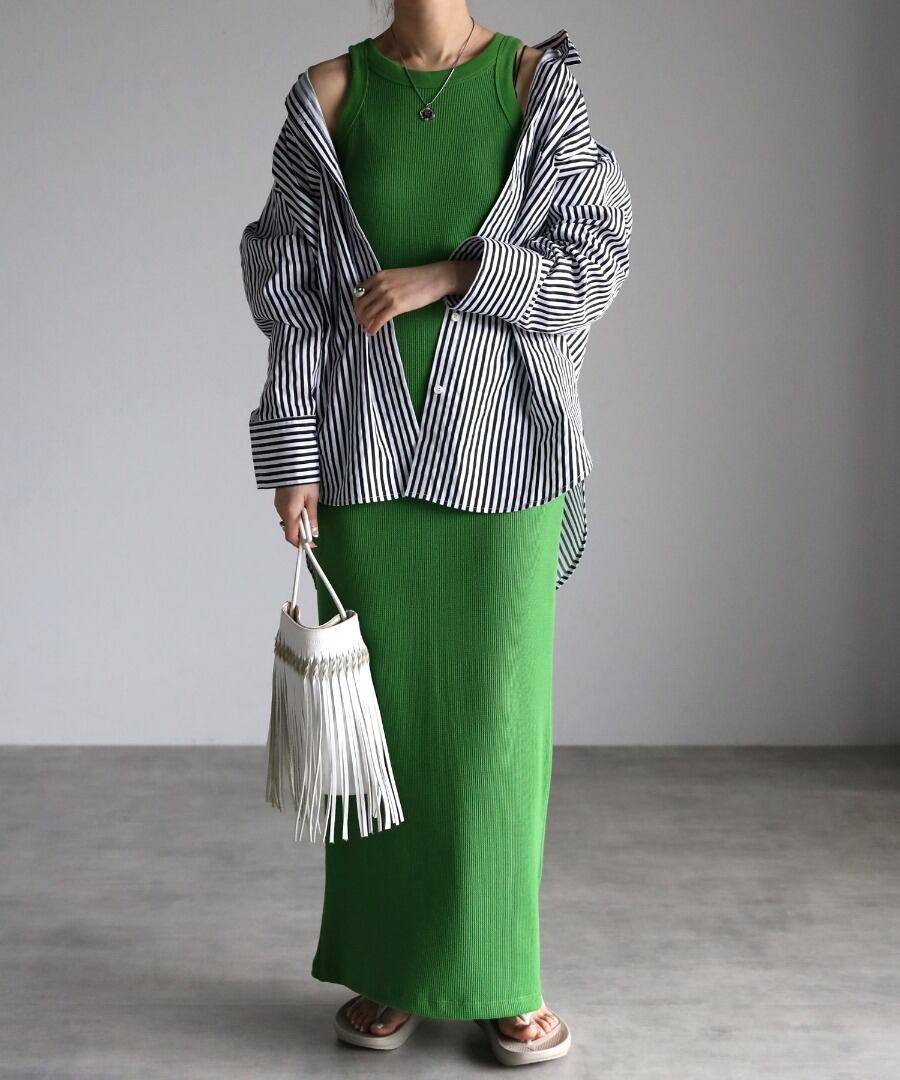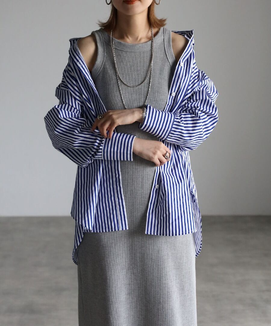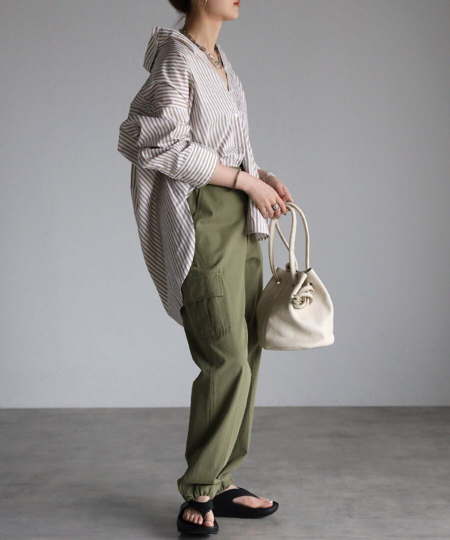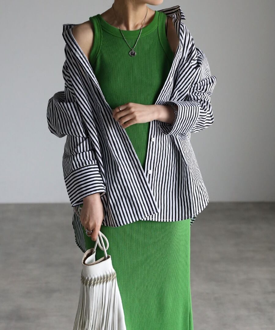 タックパンツとスニーカーでメンズライクなスタイルや、 キャミワンピースに羽織ったりスカートと組み合わてもコーデ映えする、着回し力抜群のシャツです。