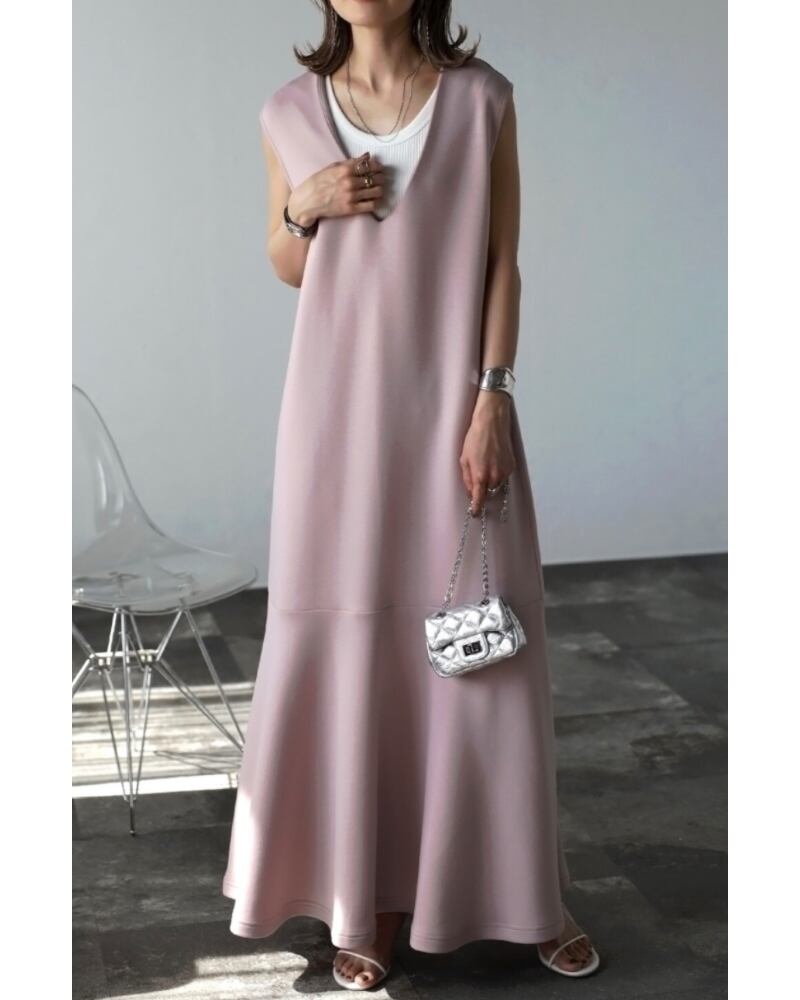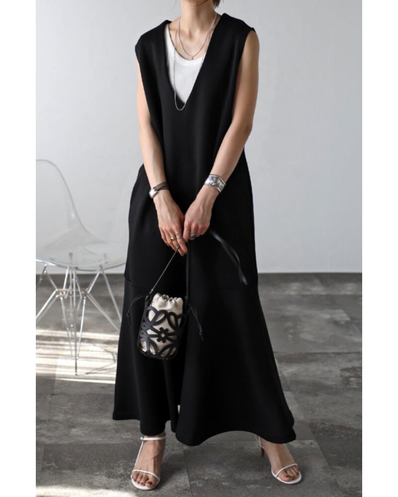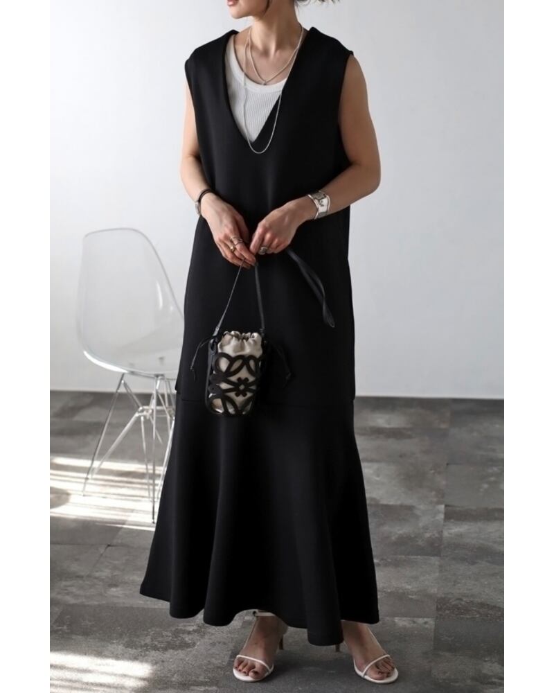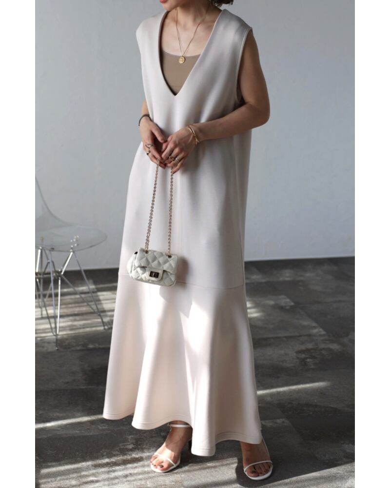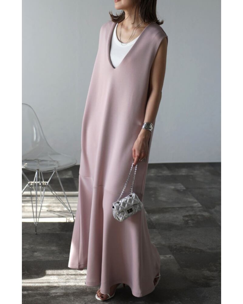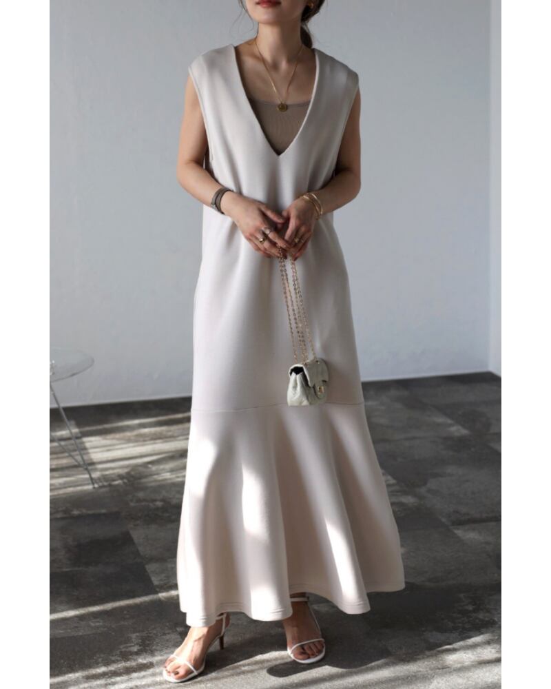 上品で女性らしいスタイルが決まるVネックマーメイドワンピース
