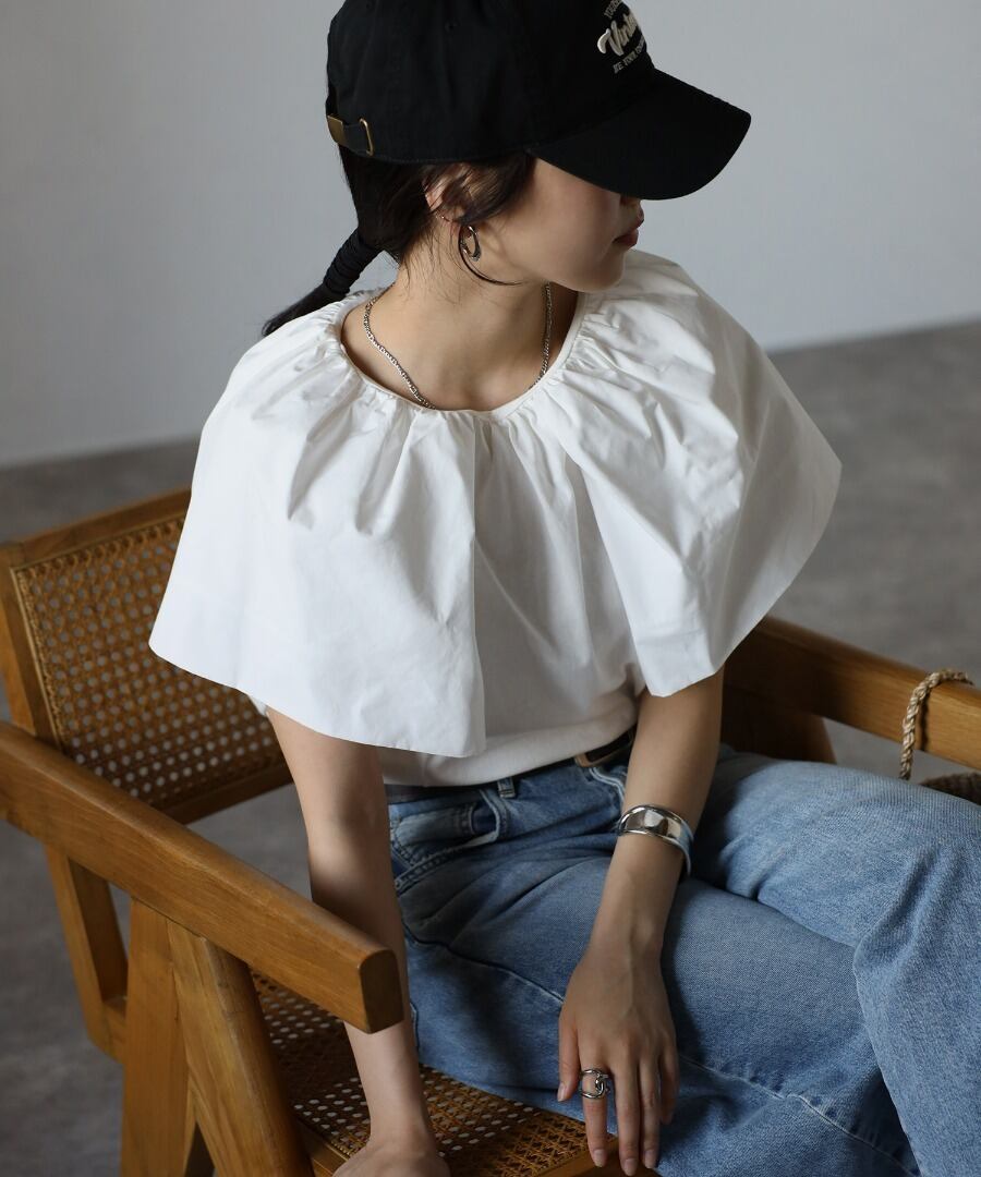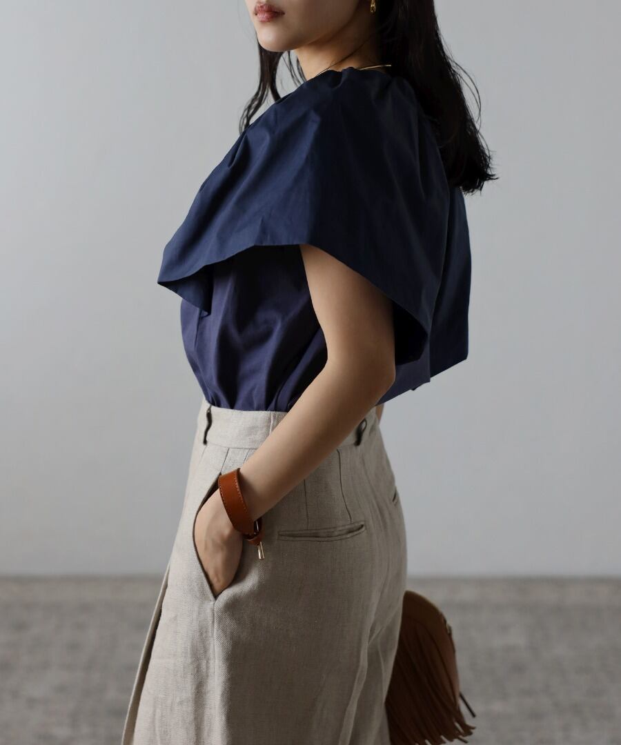 肩周りを可愛くカバーしてくれるケープカラーが魅力のデザイントップス