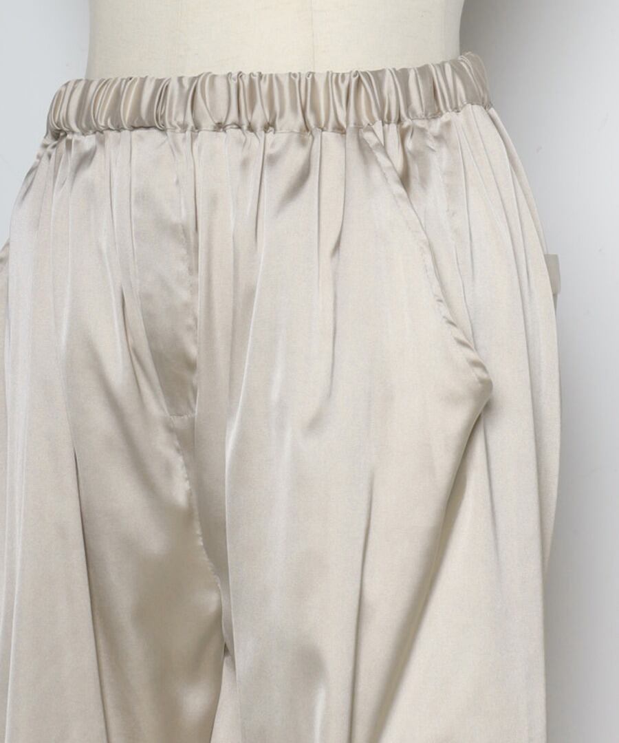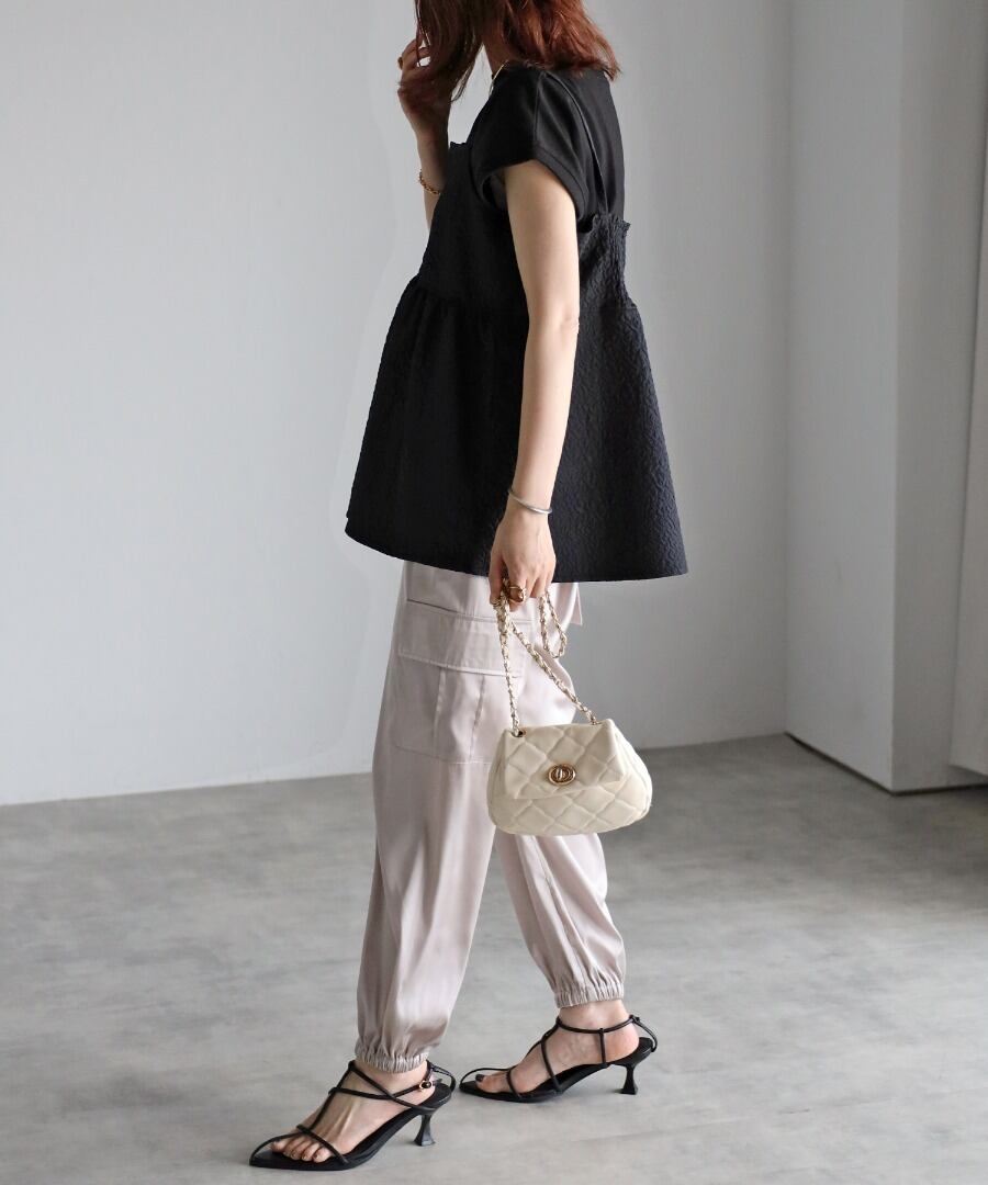 サイドポケットがカジュアルなコーディネートにマッチし、サテン素材がこなれた雰囲気。
