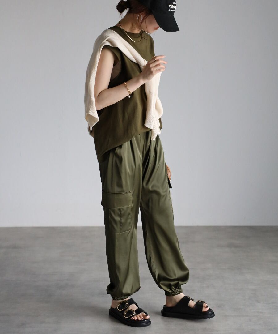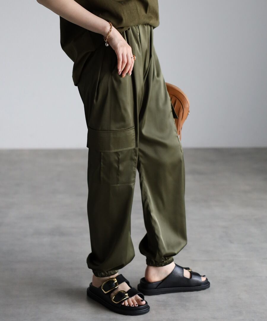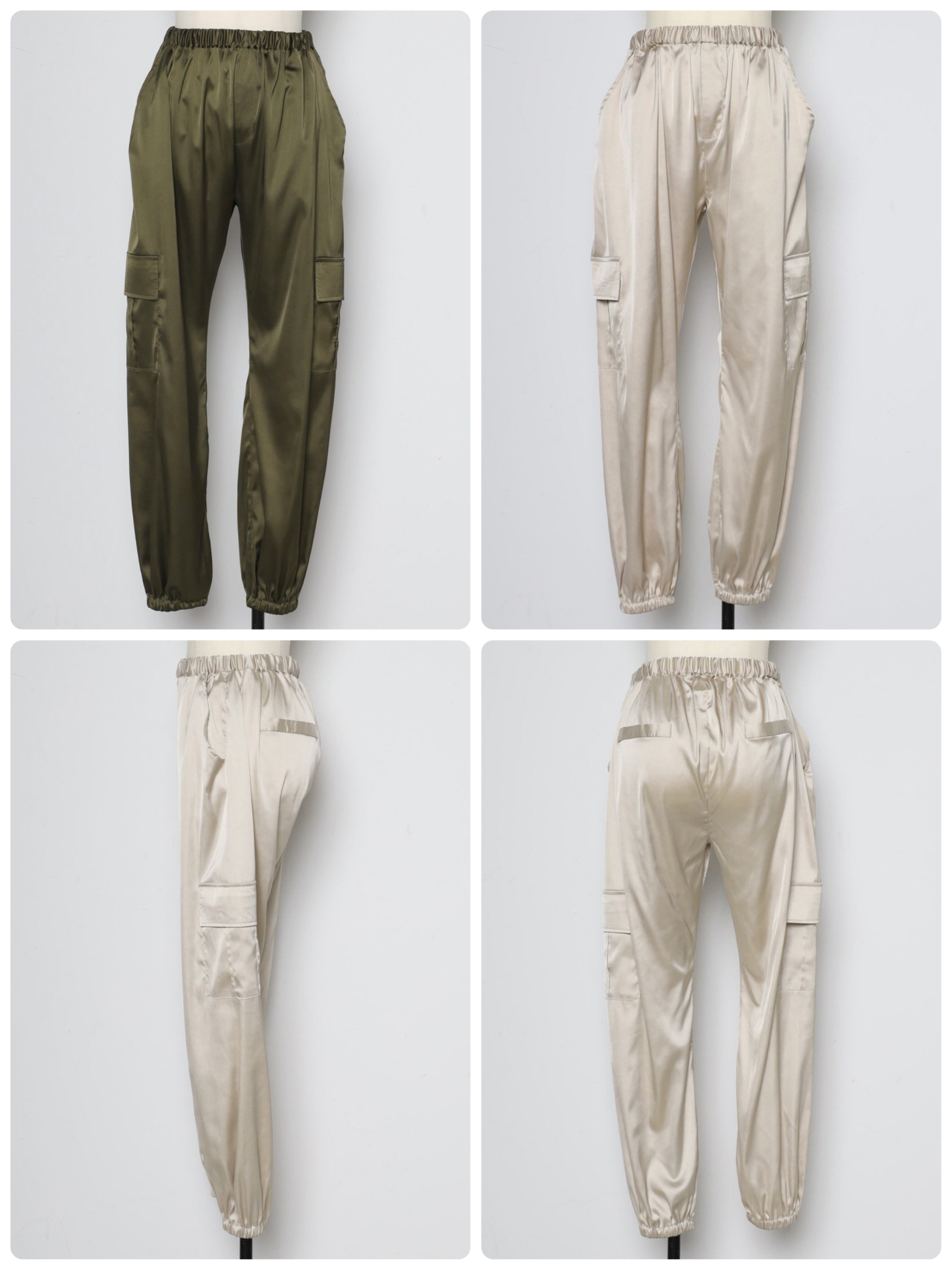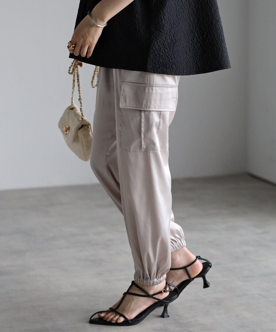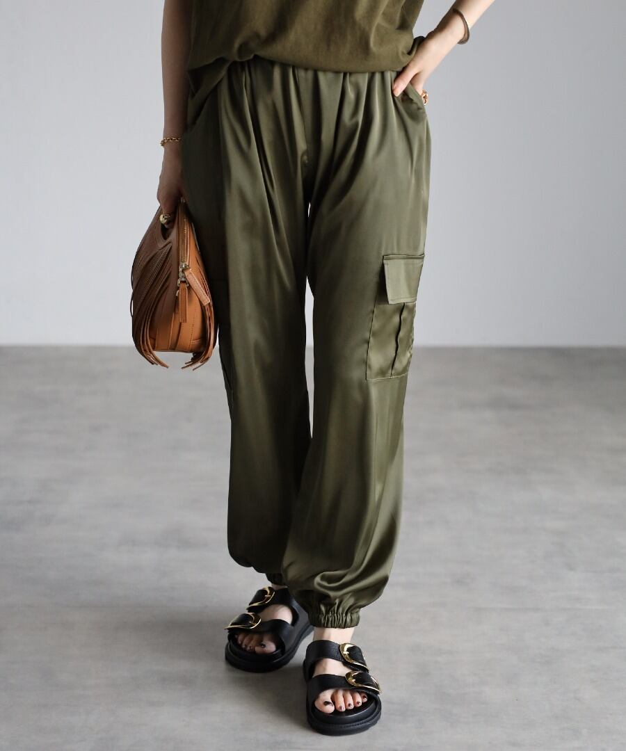 今季トレンドのカーゴパンツに、サテン素材が登場。