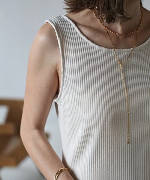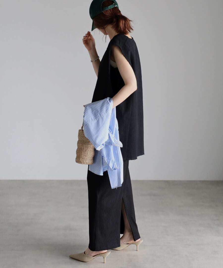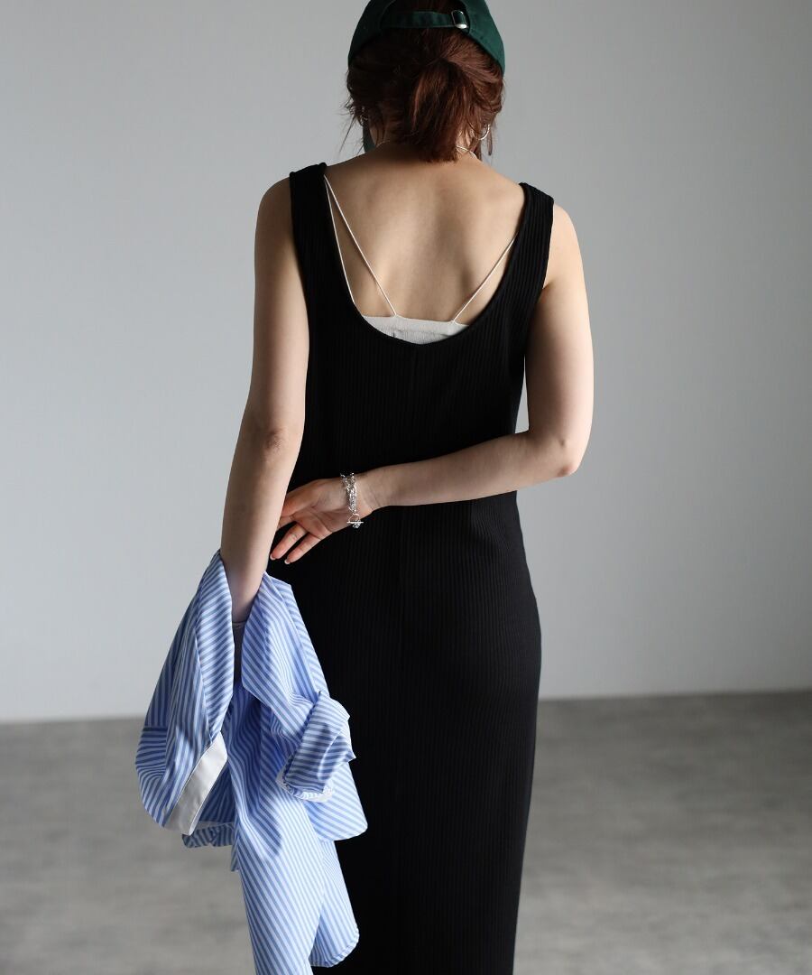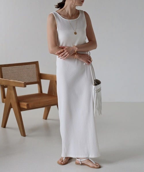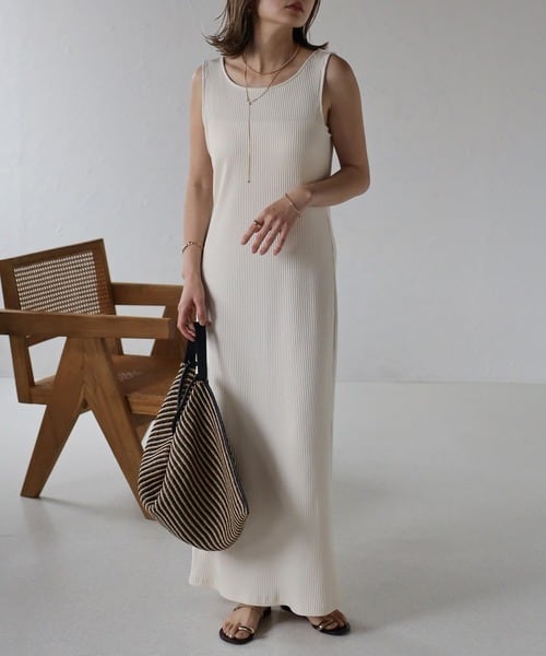 ワンピースはリブ素材のマキシ丈で、1枚でもすっきりと着られるシルエット。