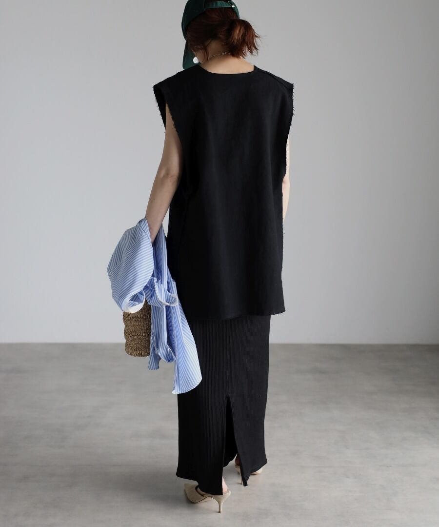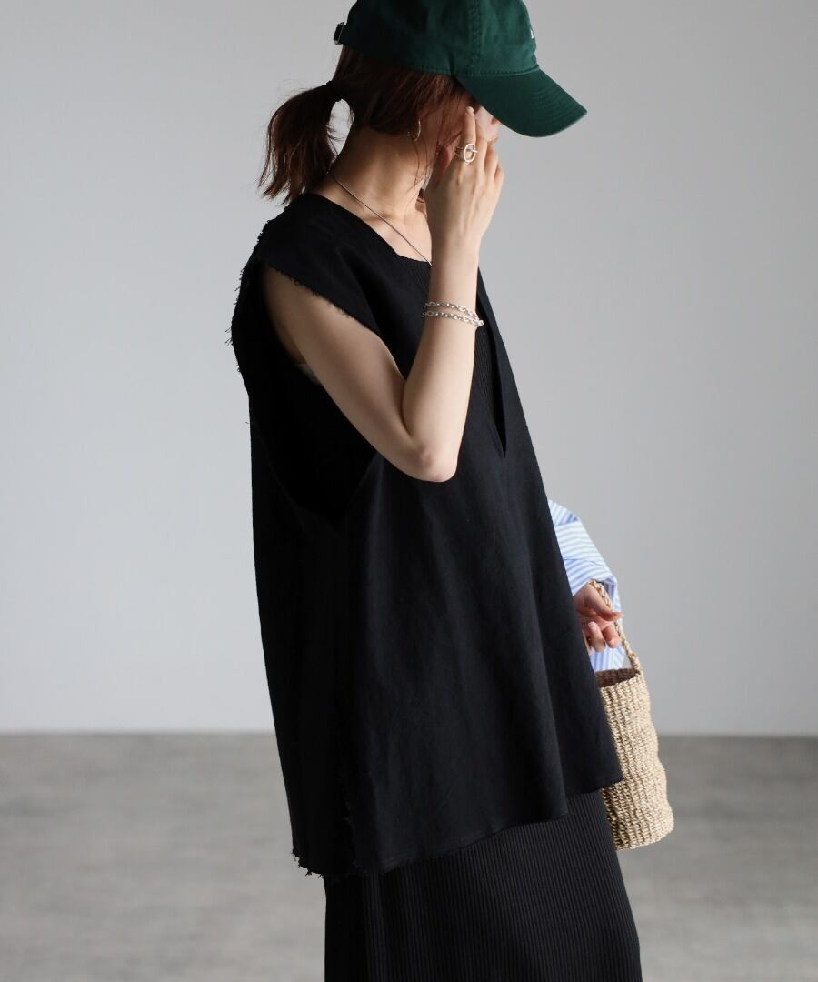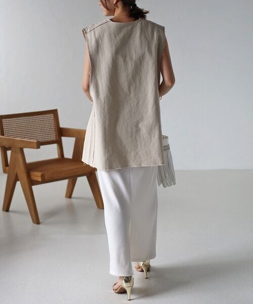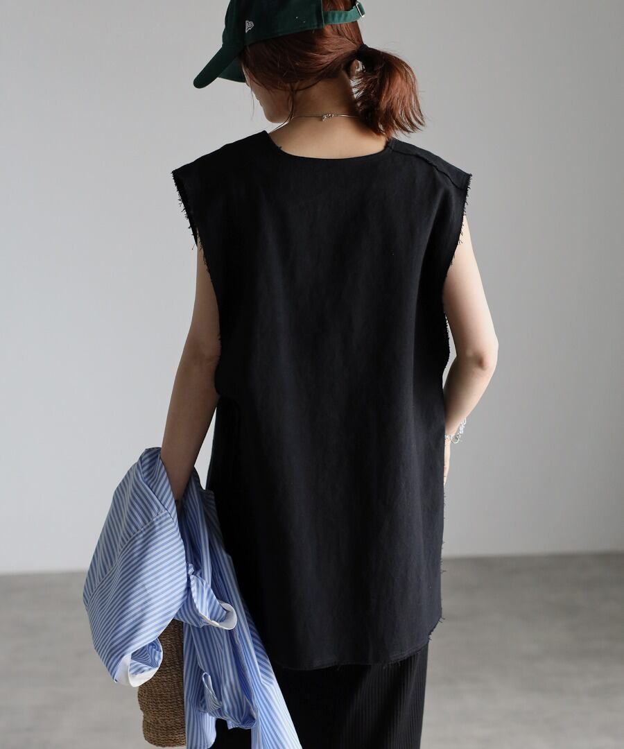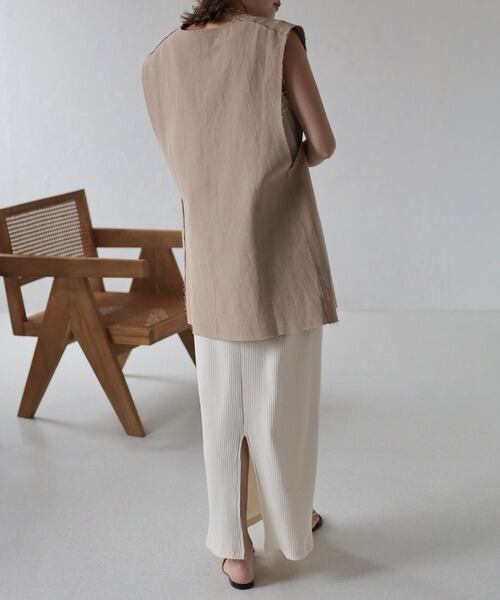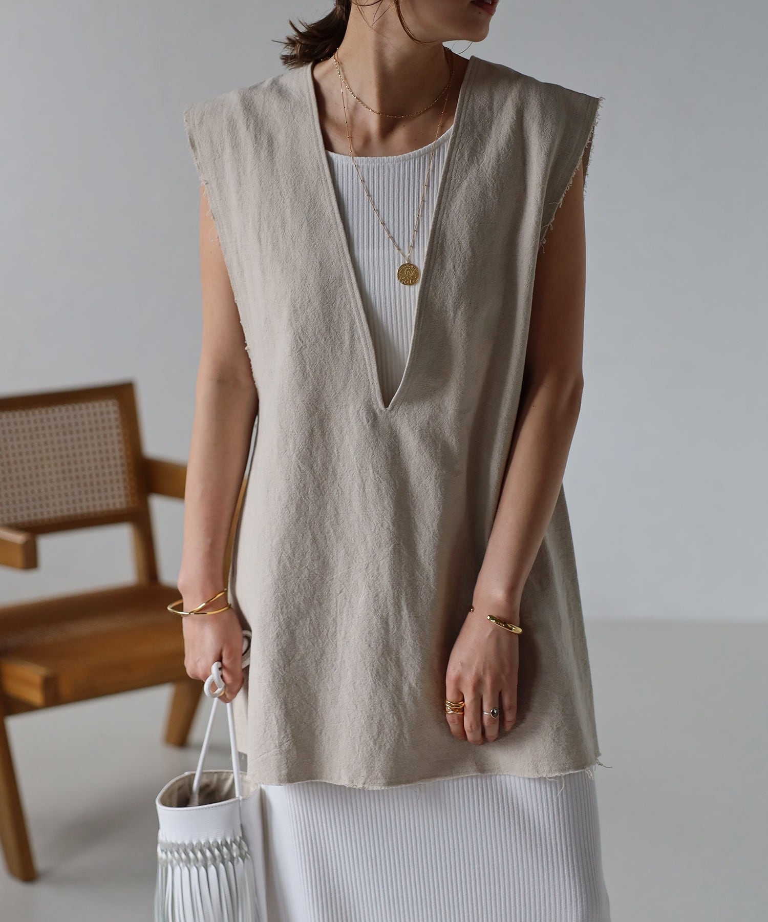 トップスのベストはトレンドのディープVネックデザインで、涼しく着られるリネン混素材です。