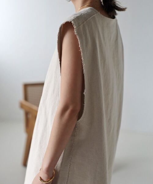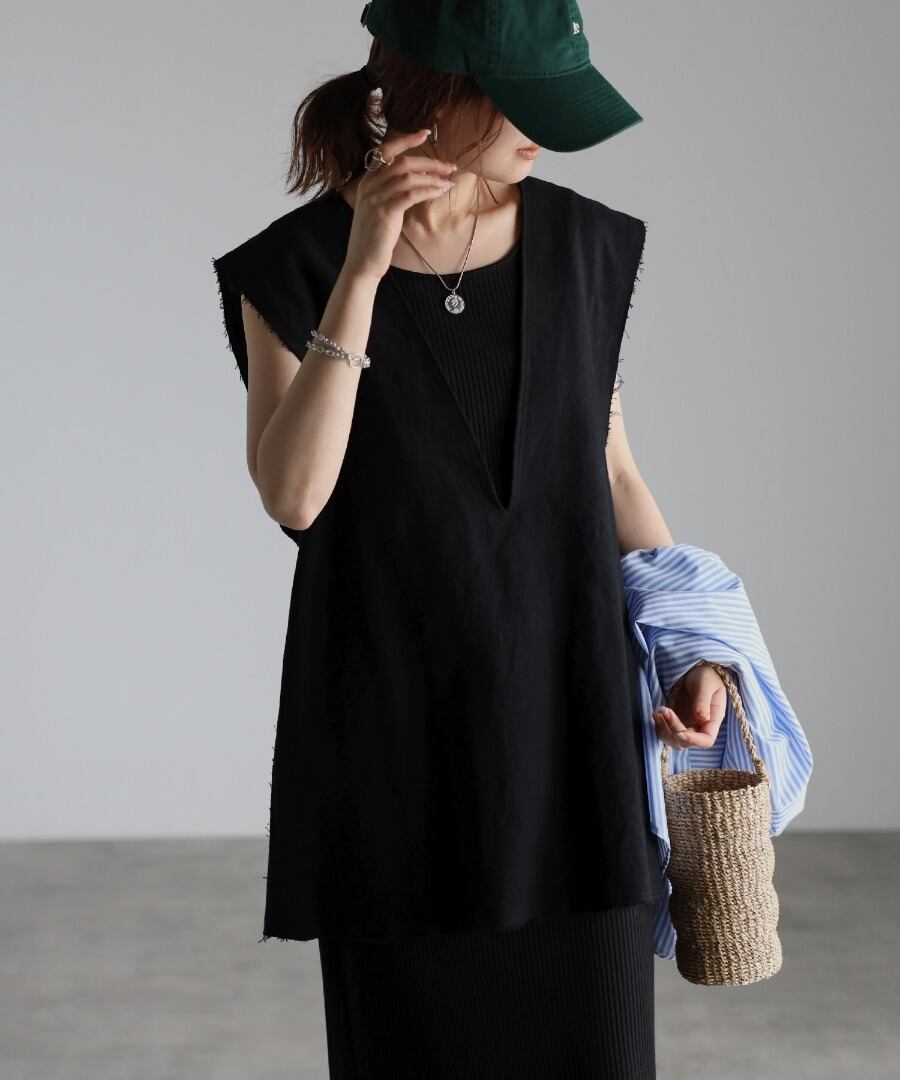 リネン混のVネックベストとリブワンピースがセットになった、嬉しいセットアイテム。
