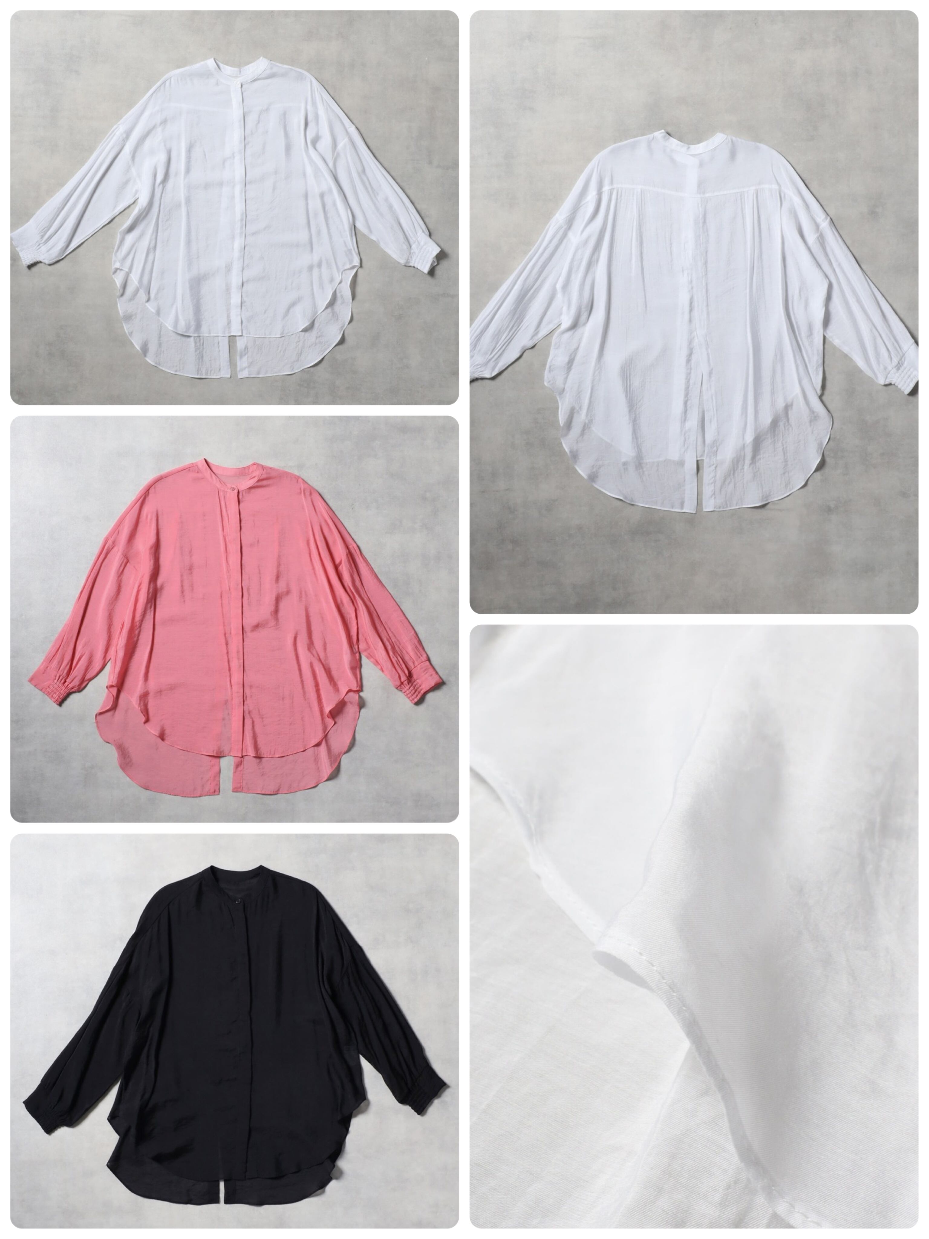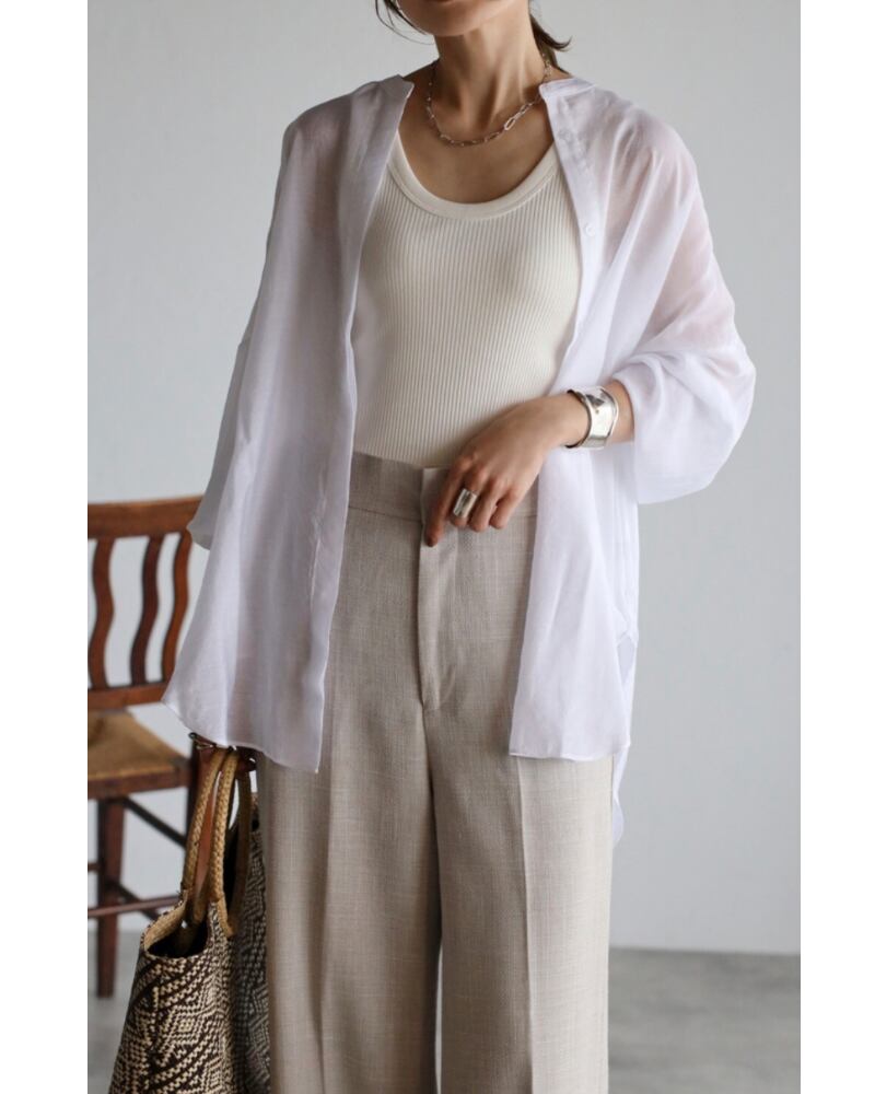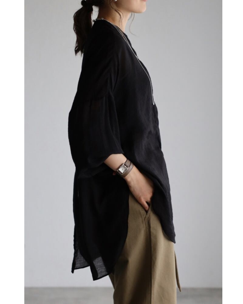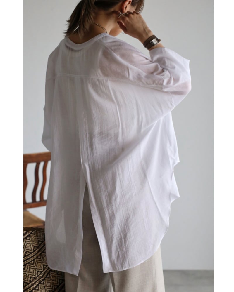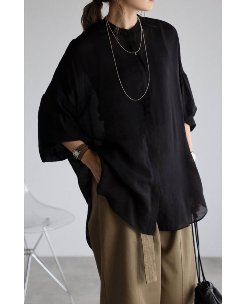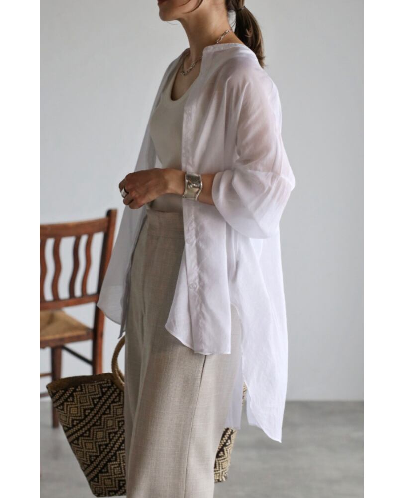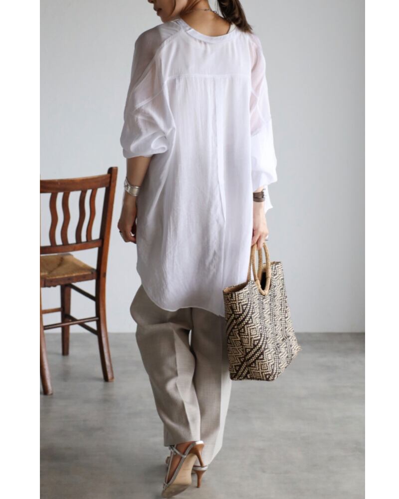 柔らかめの生地で、程よいシアー感が楽しめるバンドカラーシャツチュニック。