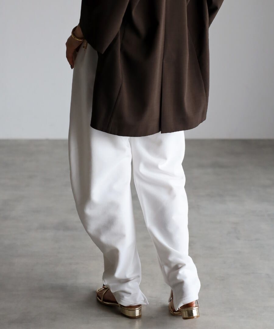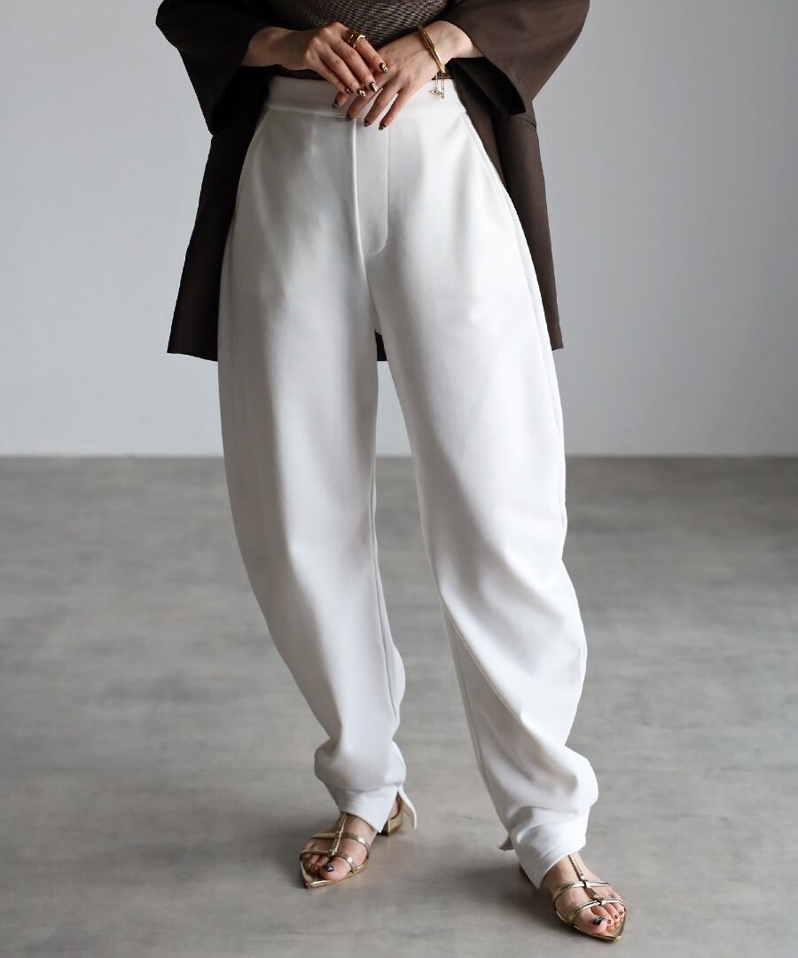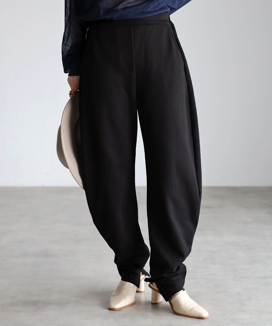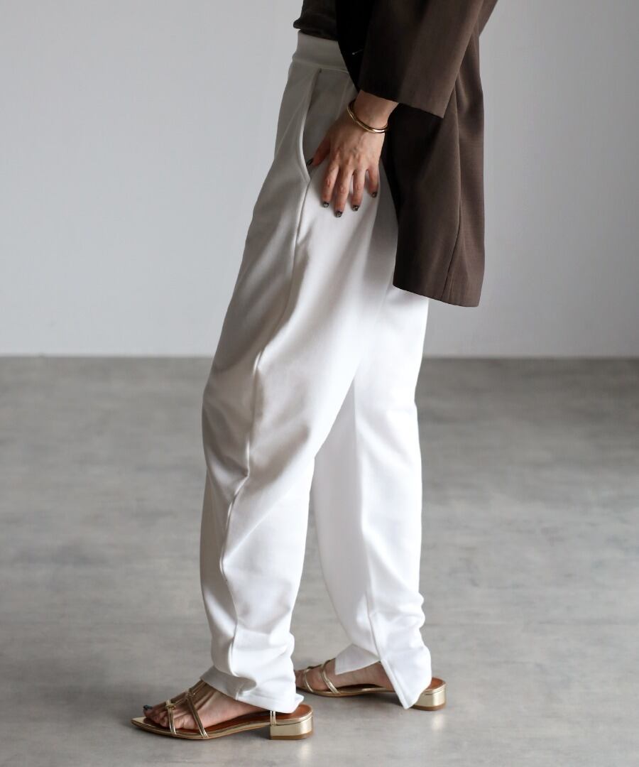 カーブラインがポイントで、裾に向けてテーパードのシルエットがこなれた雰囲気。