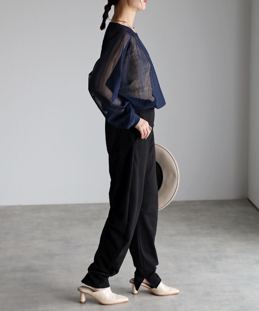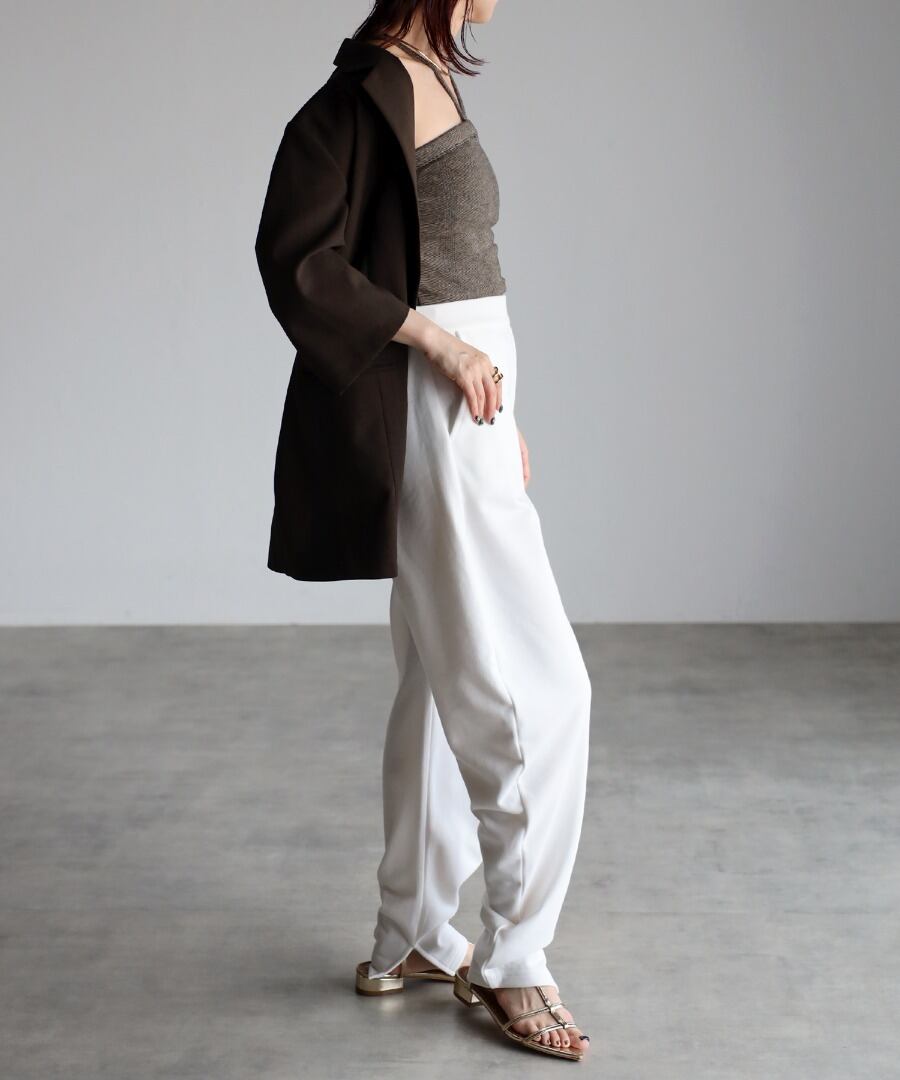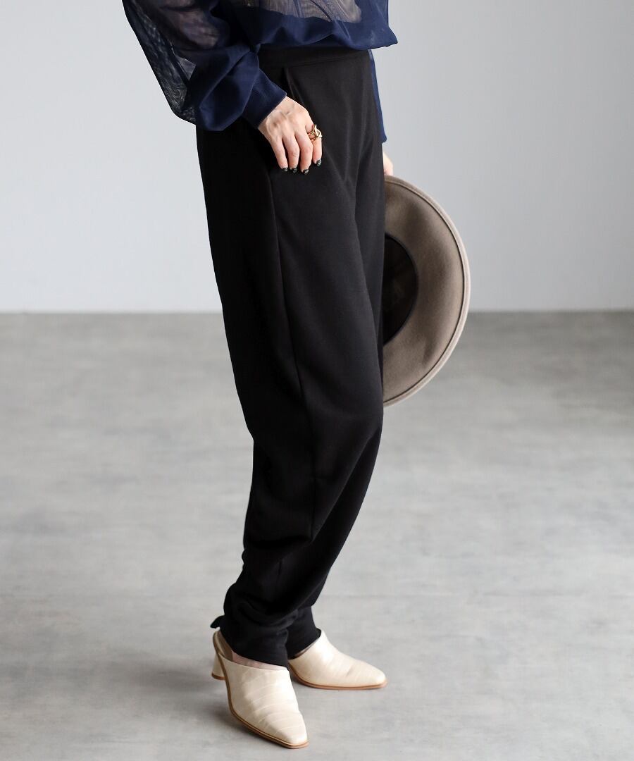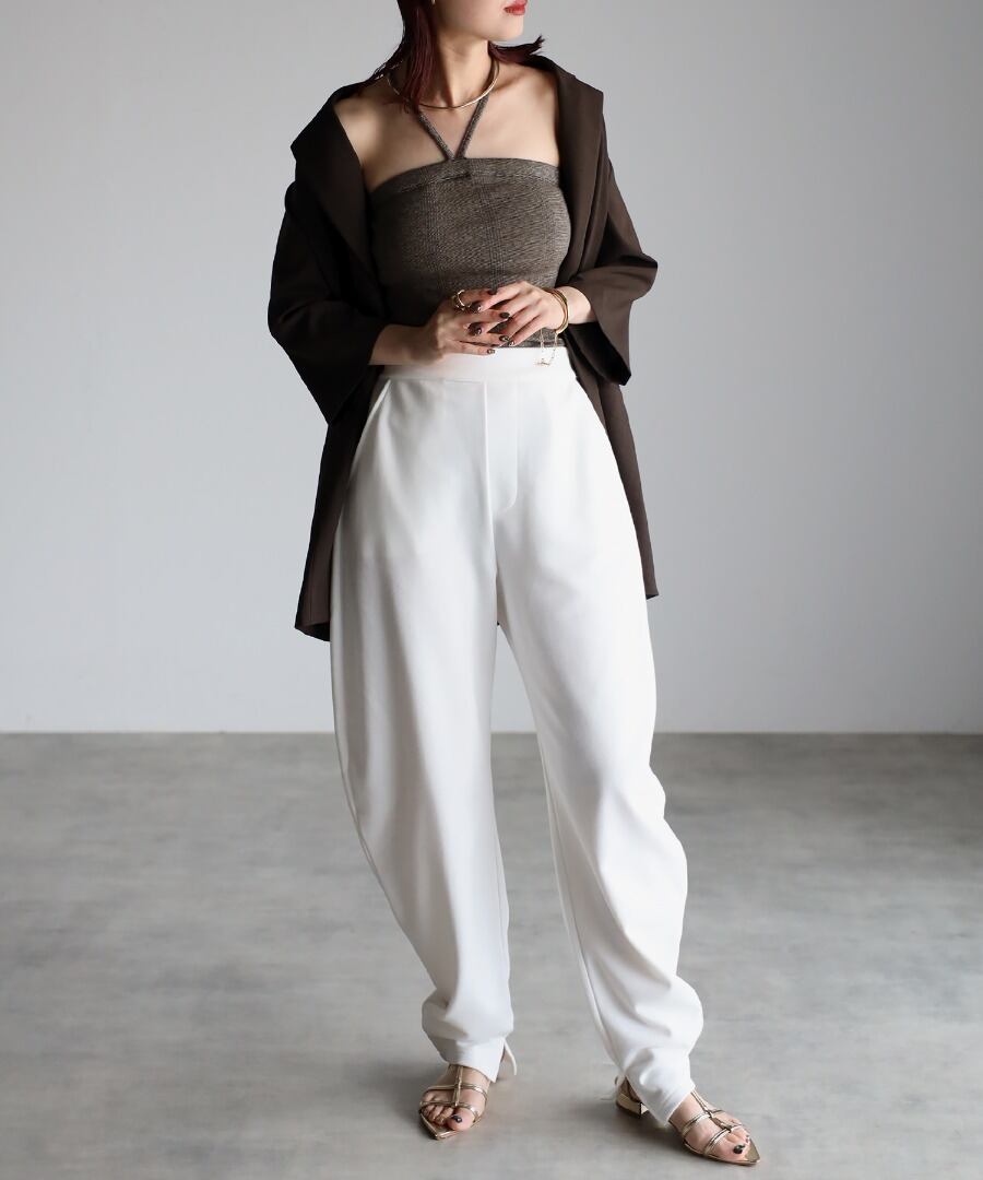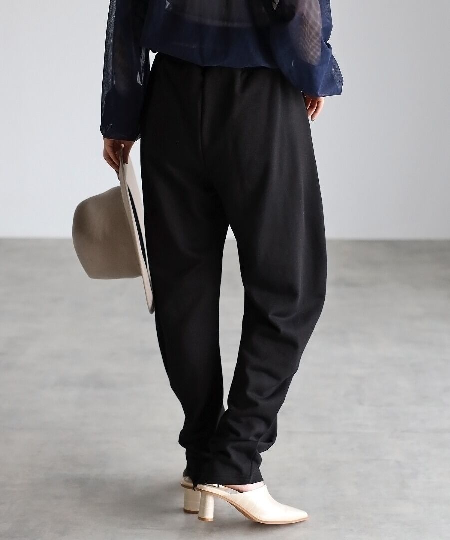 カーブラインがポイントで、裾に向けてテーパードのシルエットがこなれた雰囲気。