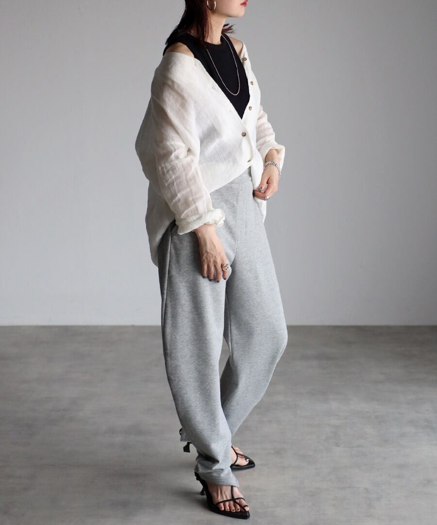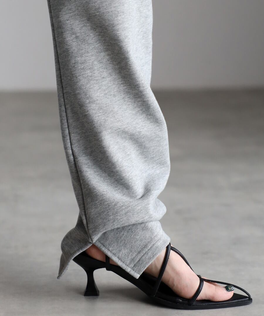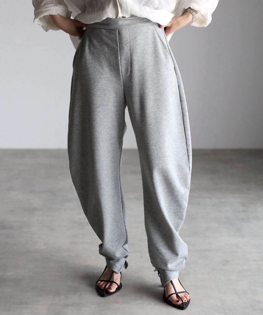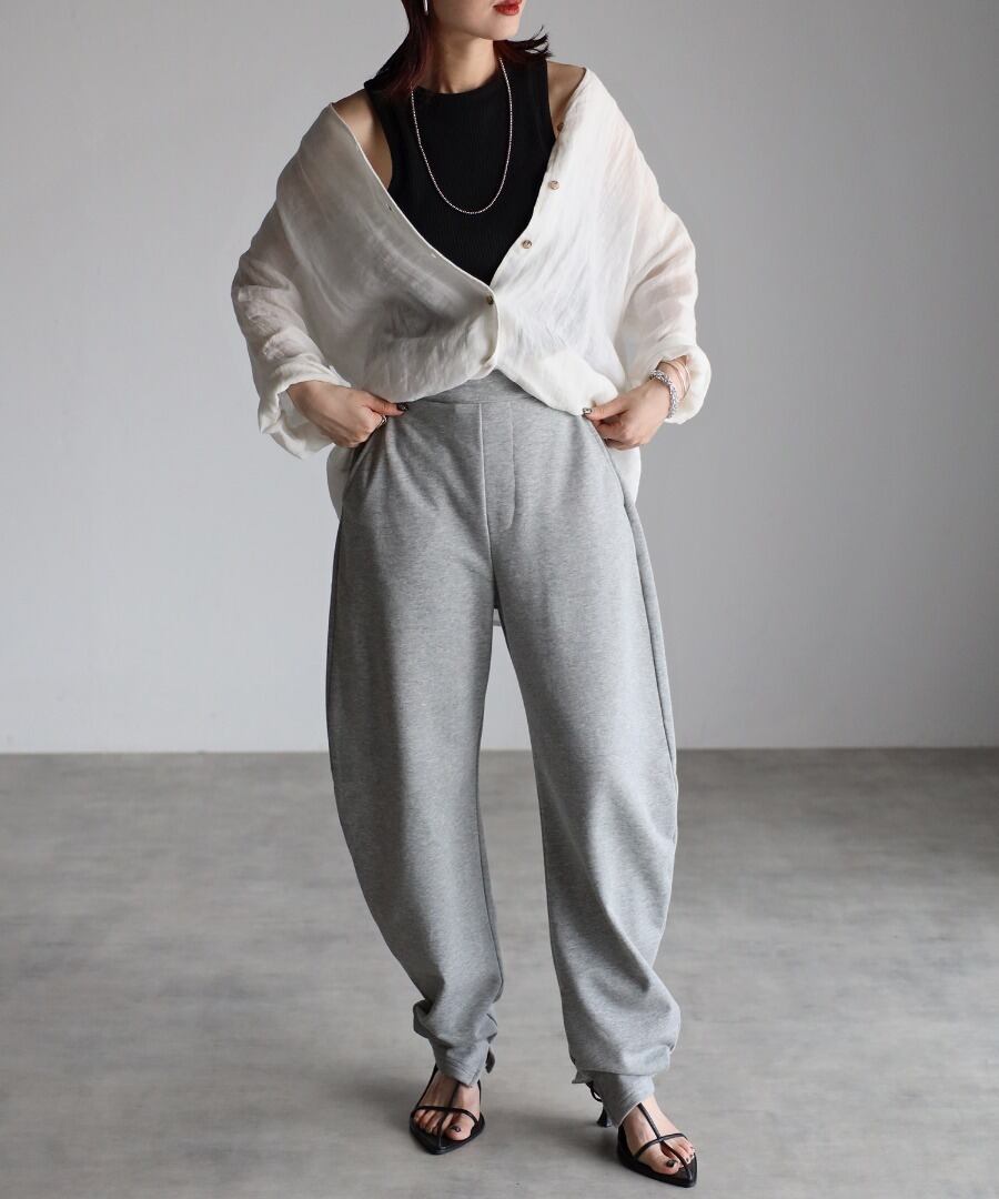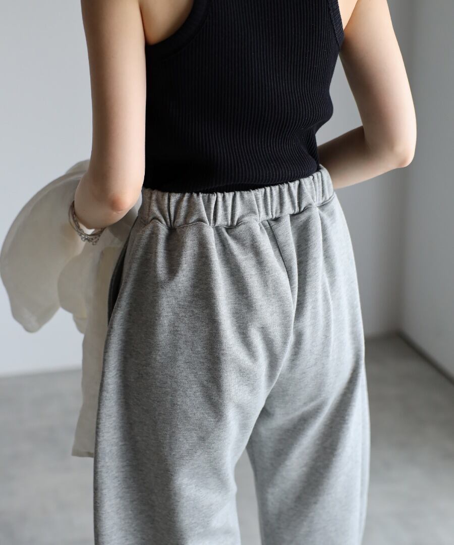 カーブラインのシルエットで脚長効果が期待できるスウェットパンツ。