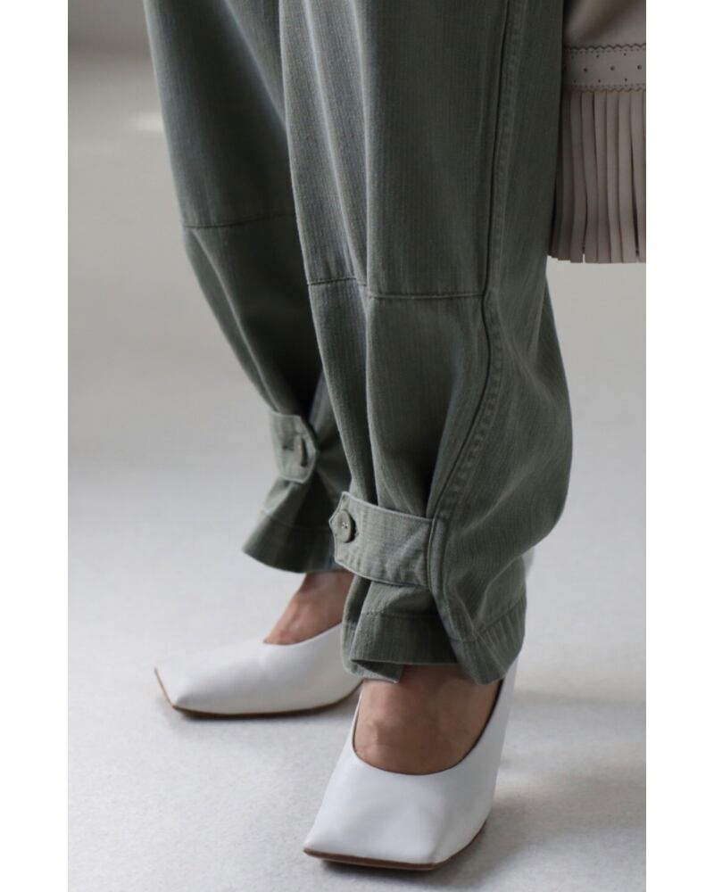裾のタブがポイントで、ボタンの留める位置で足首を絞ってシルエットをアレンジいただけます。