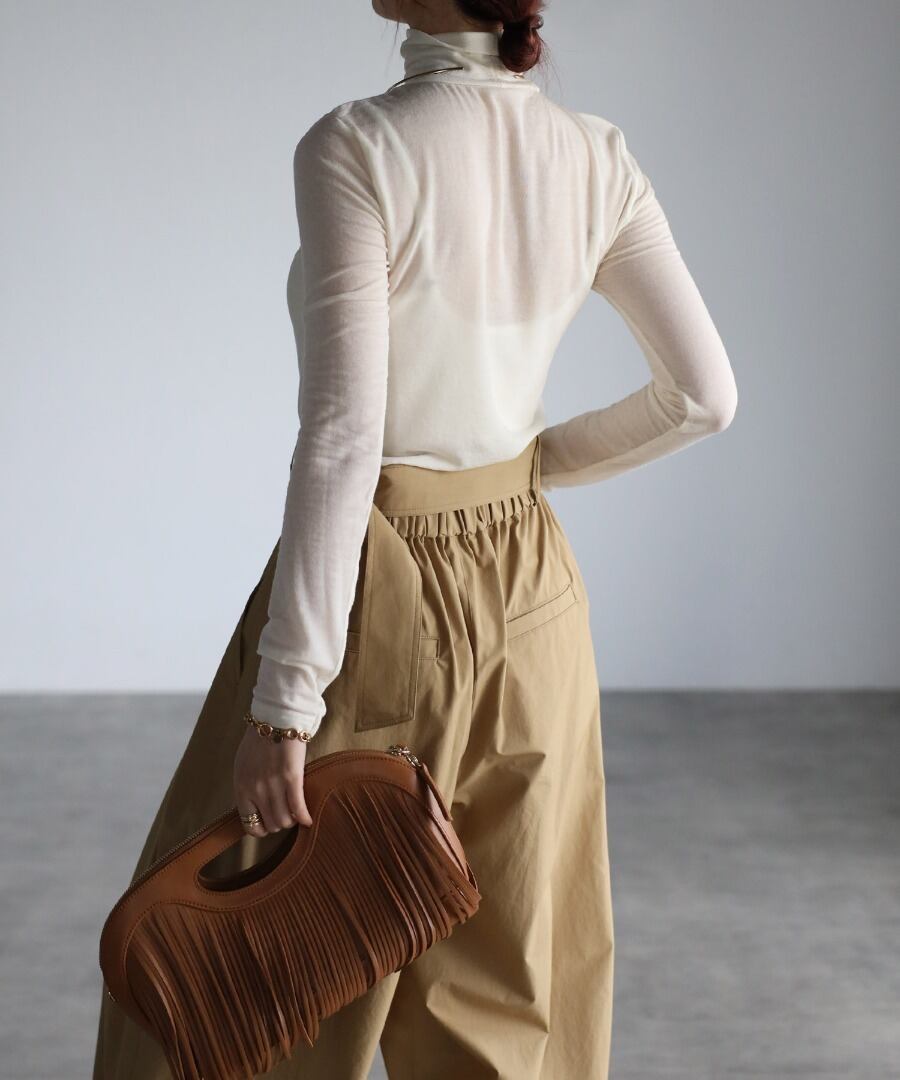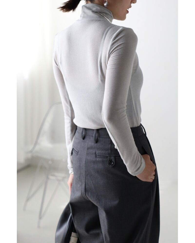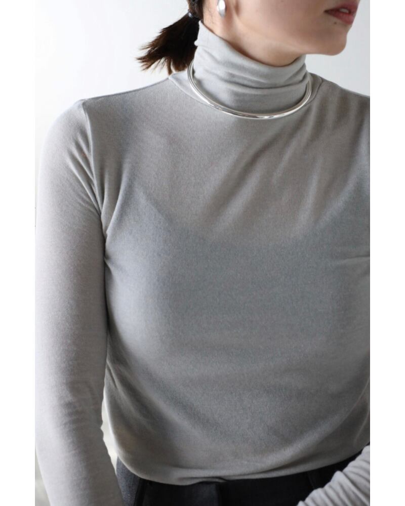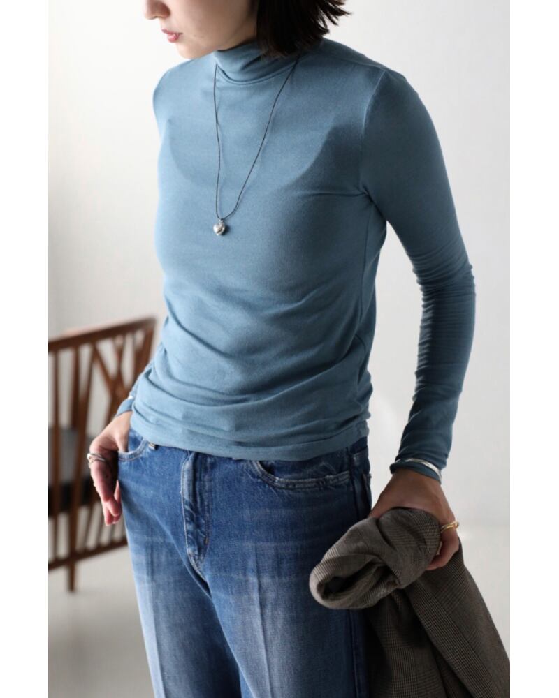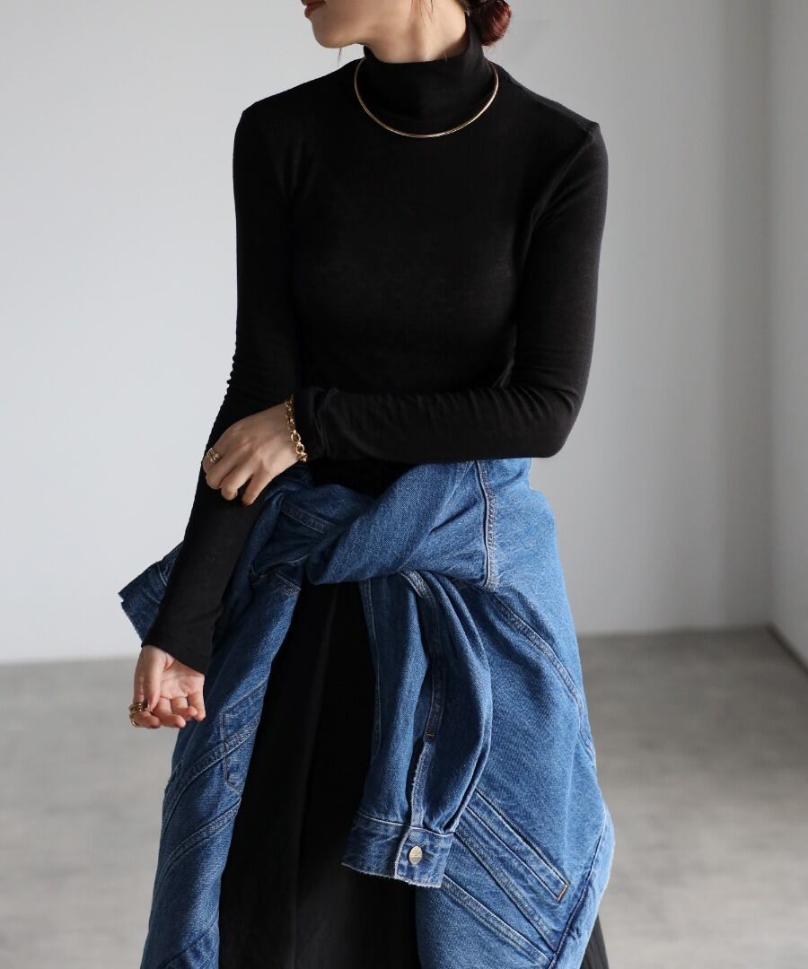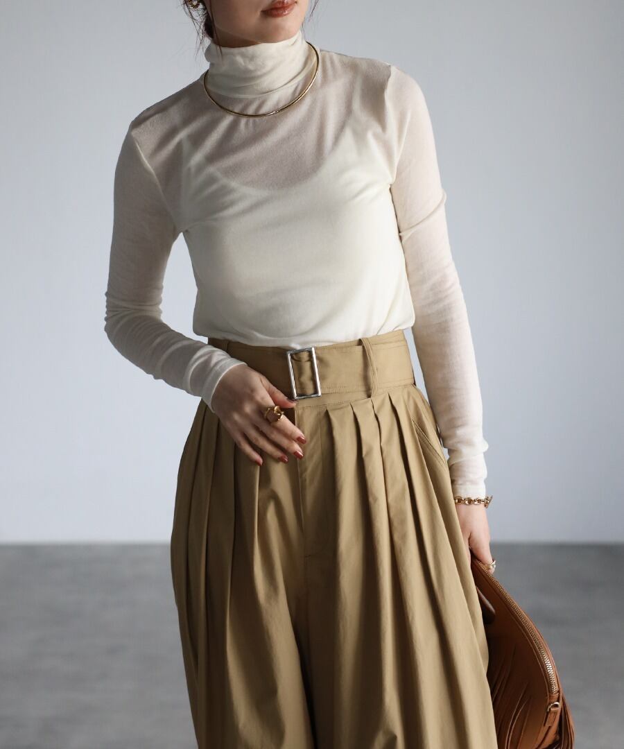 上品な透け感で女性らしい印象の着回しやすいハイネックシアートップス。