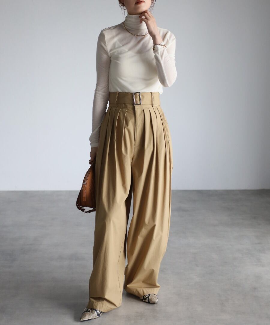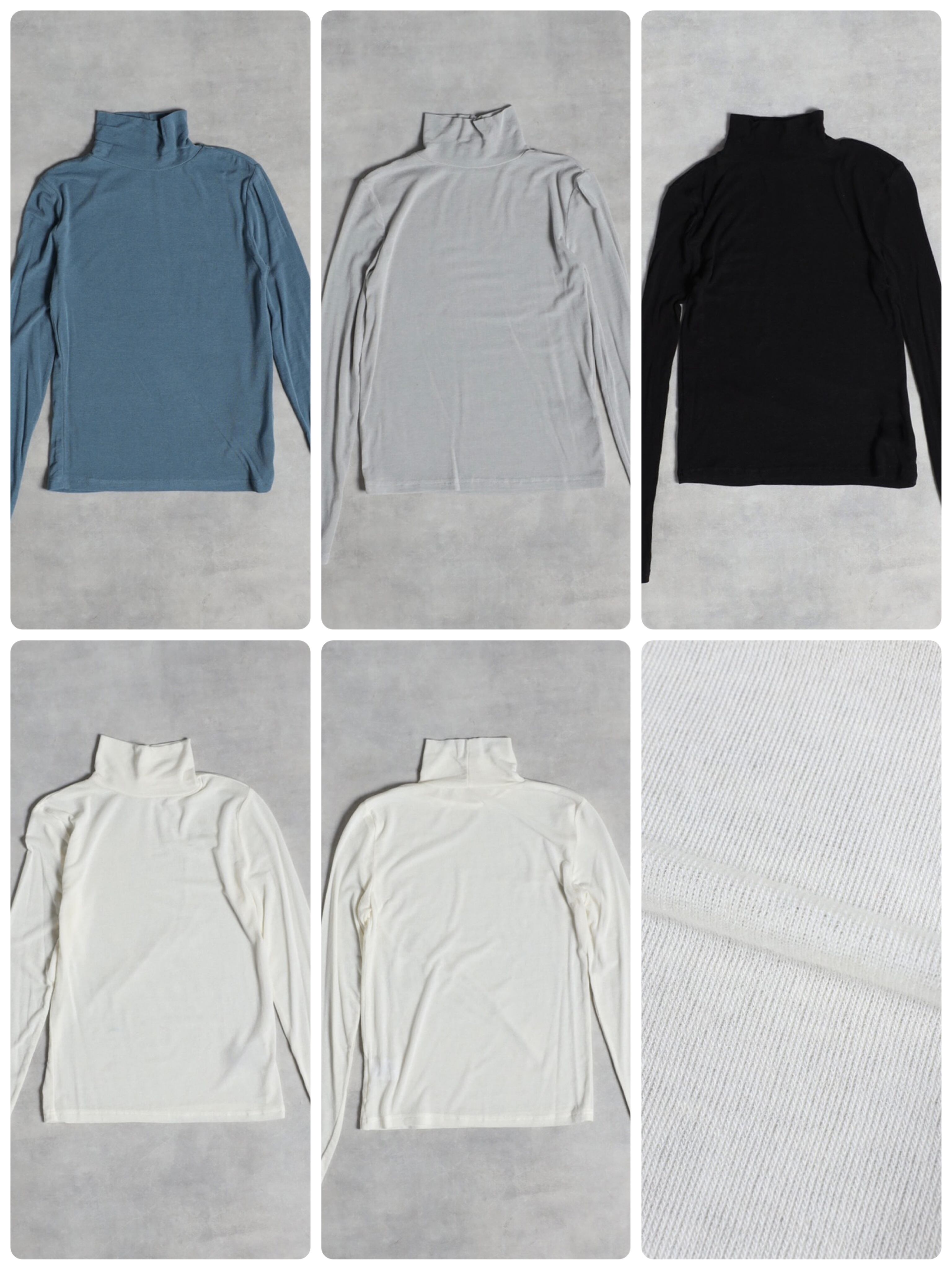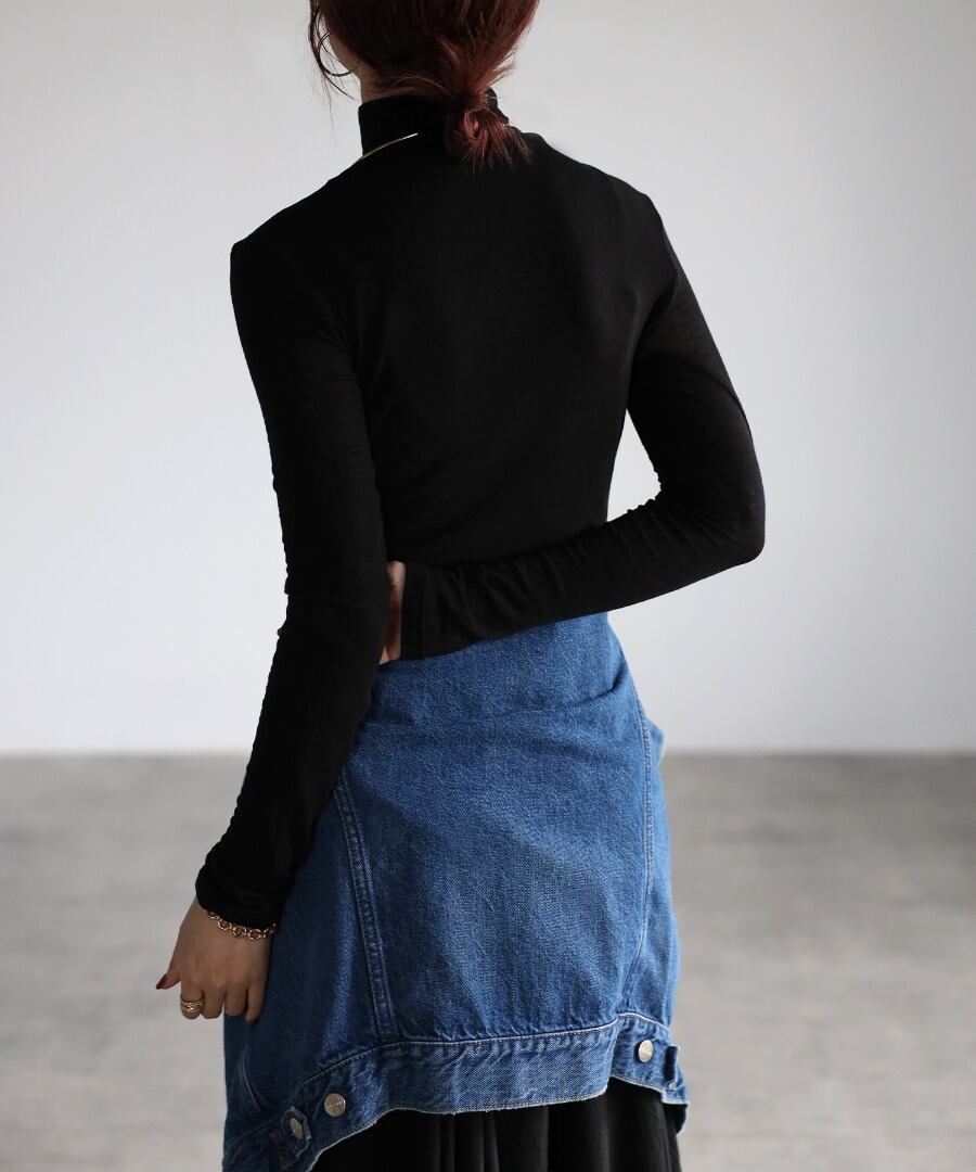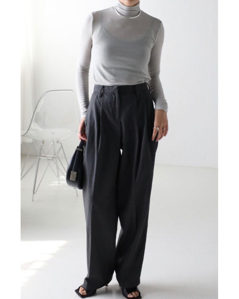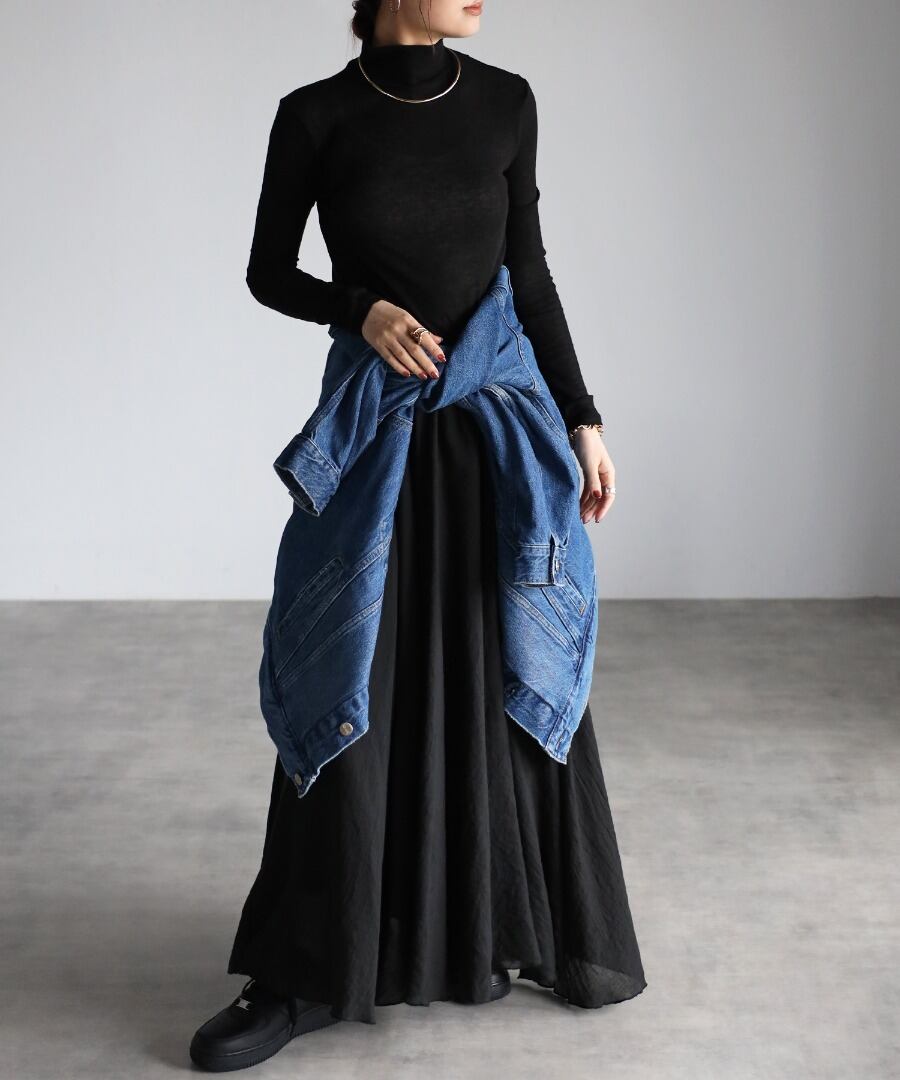 上品な透け感で女性らしい印象の着回しやすいハイネックシアートップス。