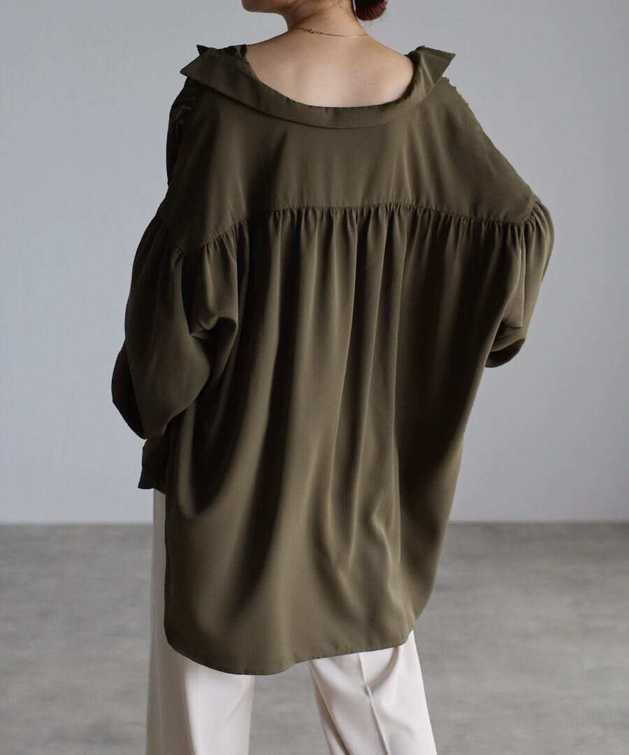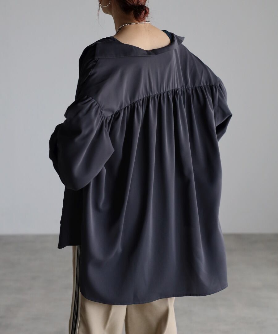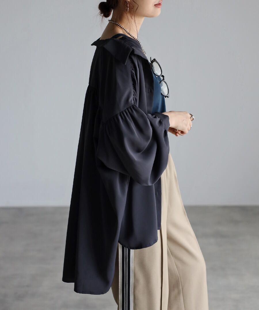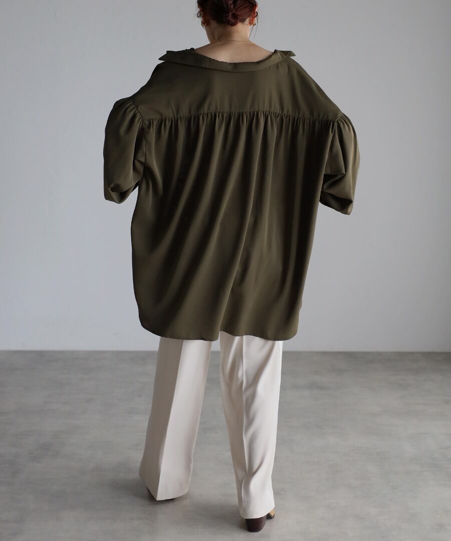シャツカラーで開襟デザインがすっきりとした印象のオーバーサイズギャザーシャツ。