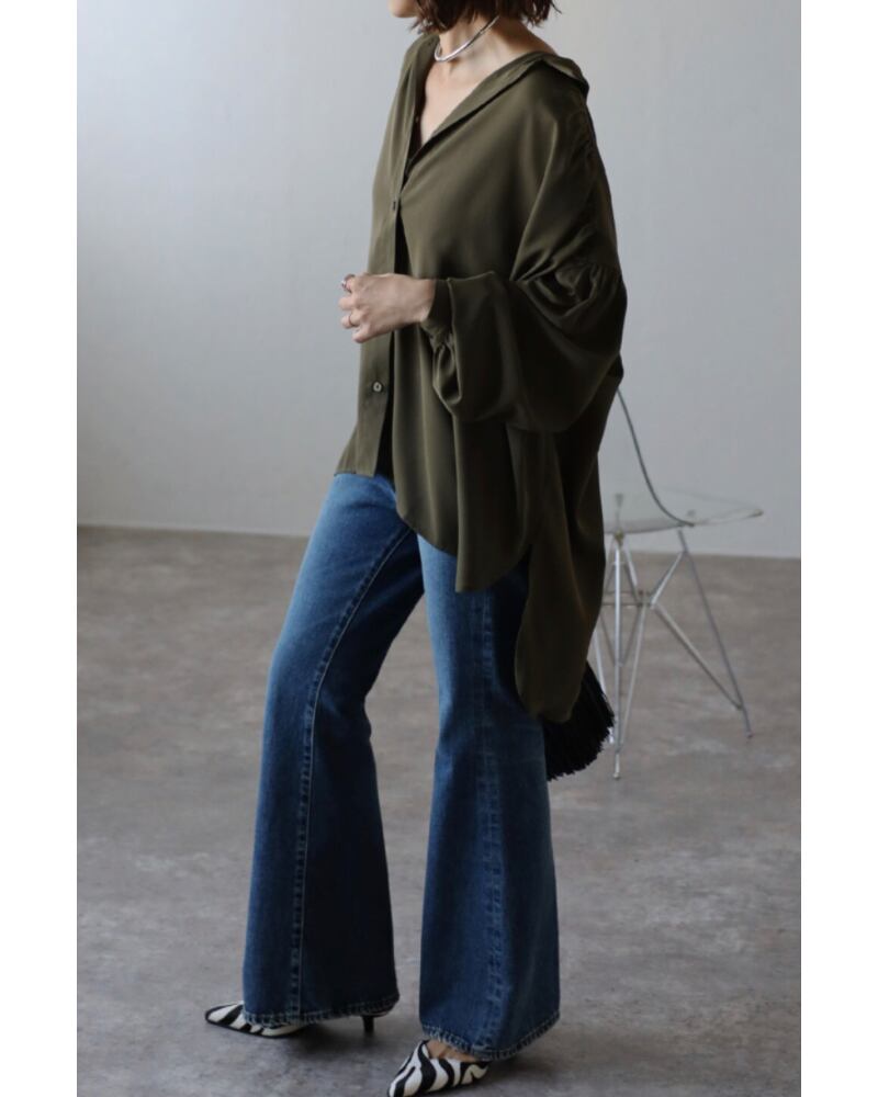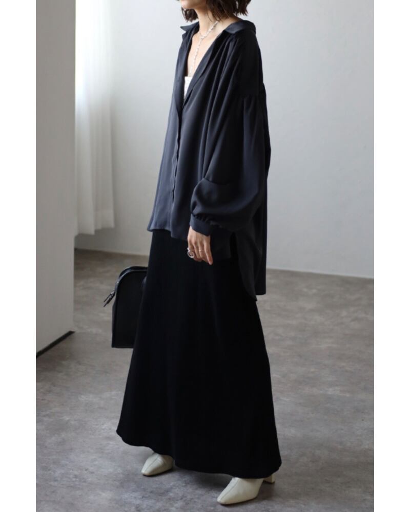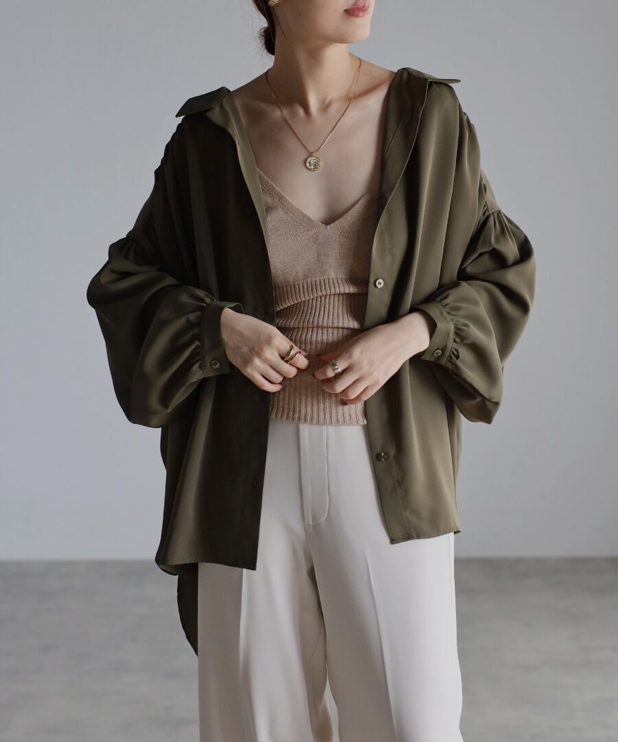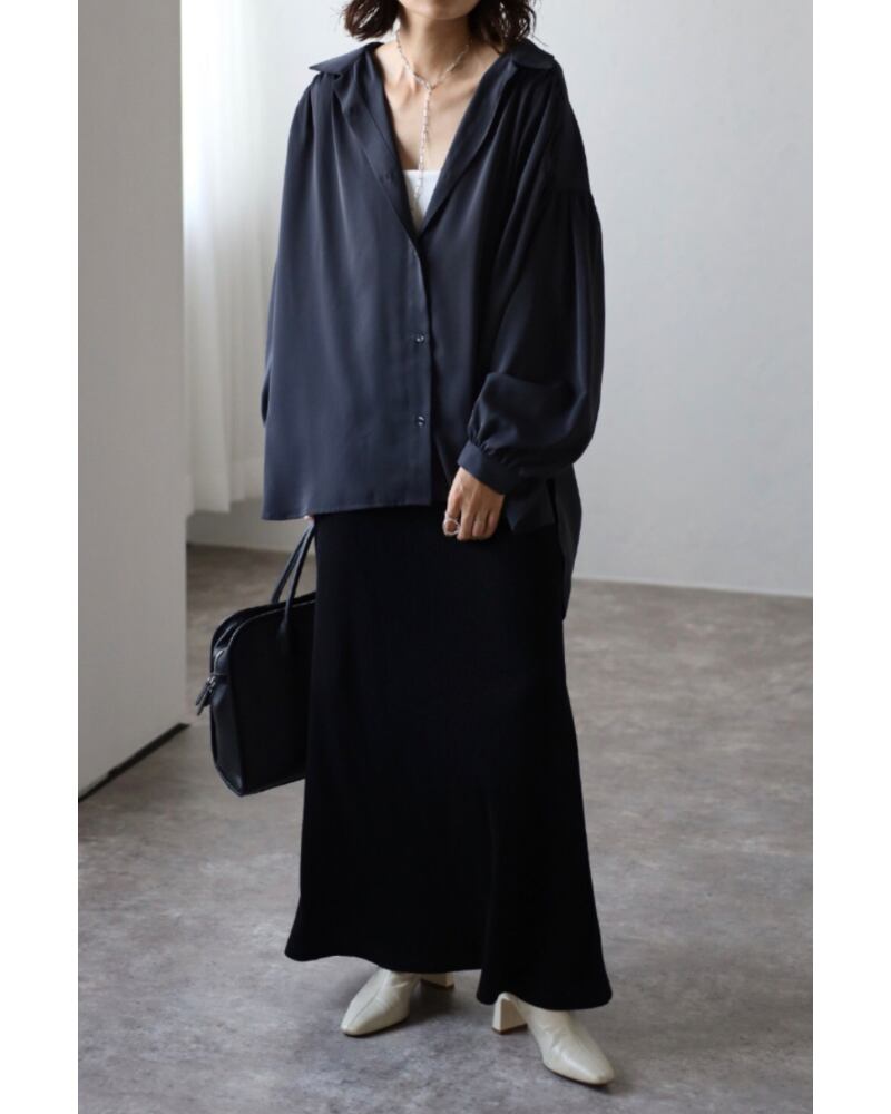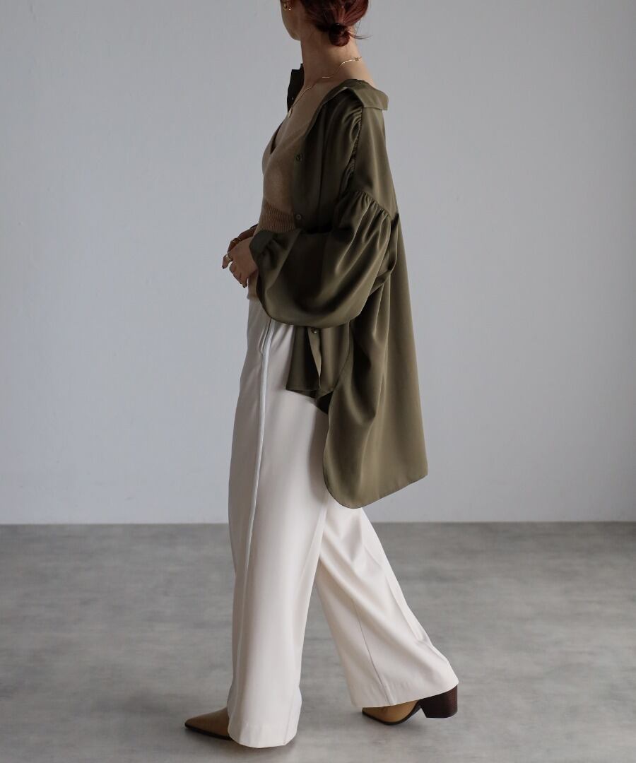 シャツカラーで開襟デザインがすっきりとした印象のオーバーサイズギャザーシャツ。