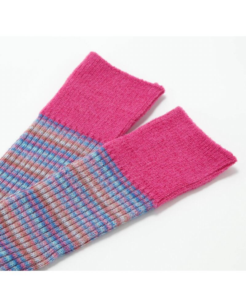 靴下は丸編み機で作られているので、まっすぐなラインは作れないため、デザインに段差などのズレが見られる場合があります。