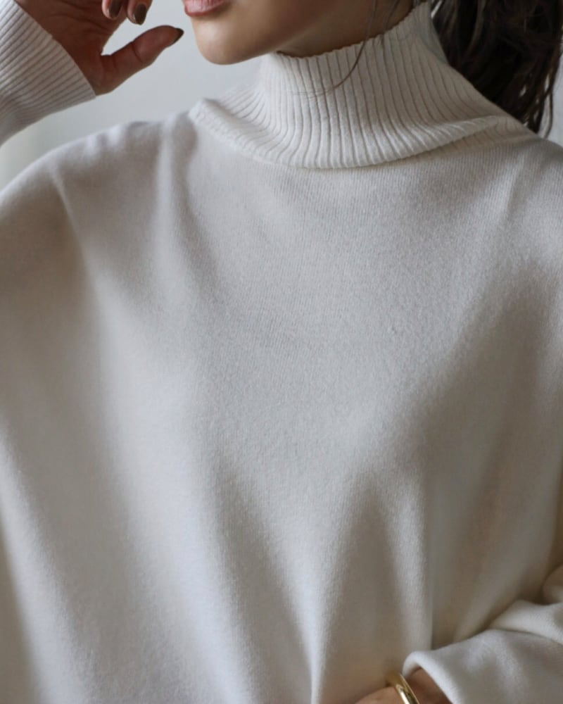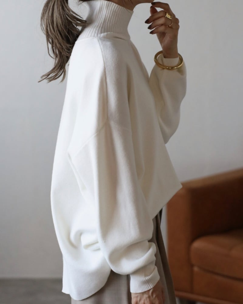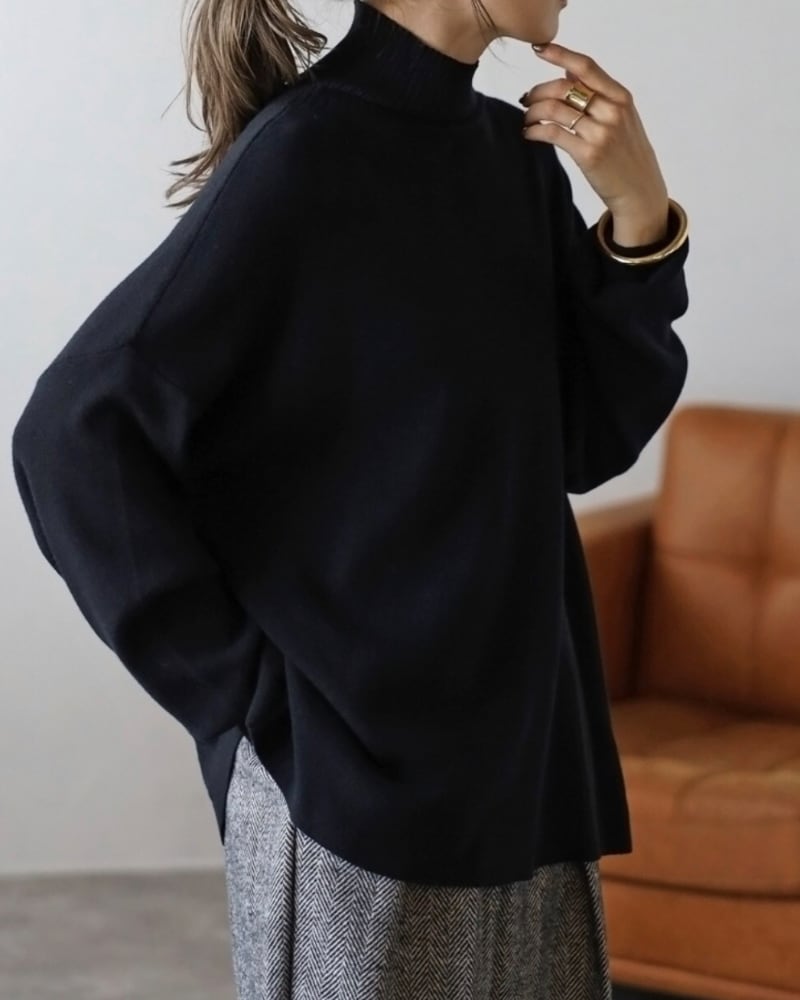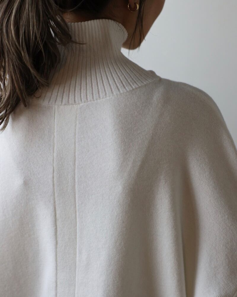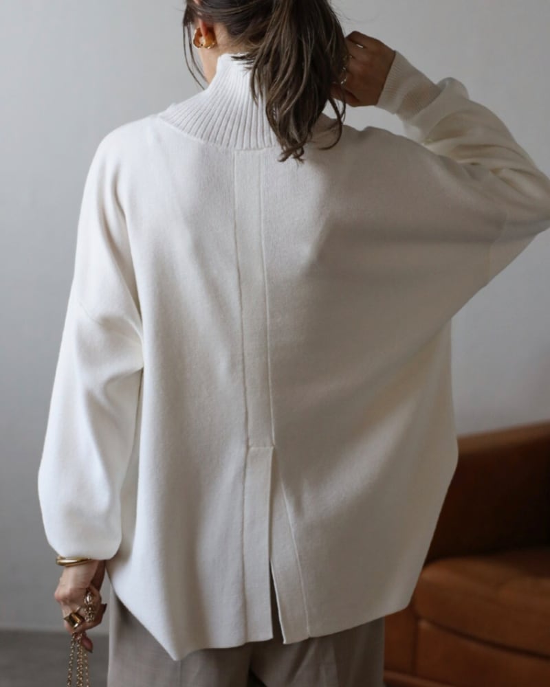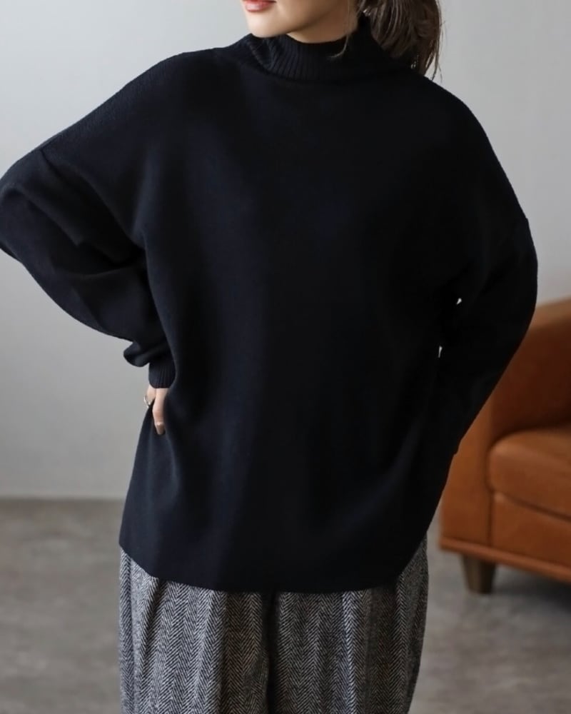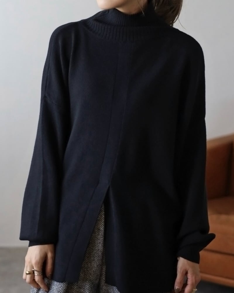 程よくゆったりとしたサイズ感に、リブ編みのタートルネックとスリットデザインがこなれ感を演出します。
