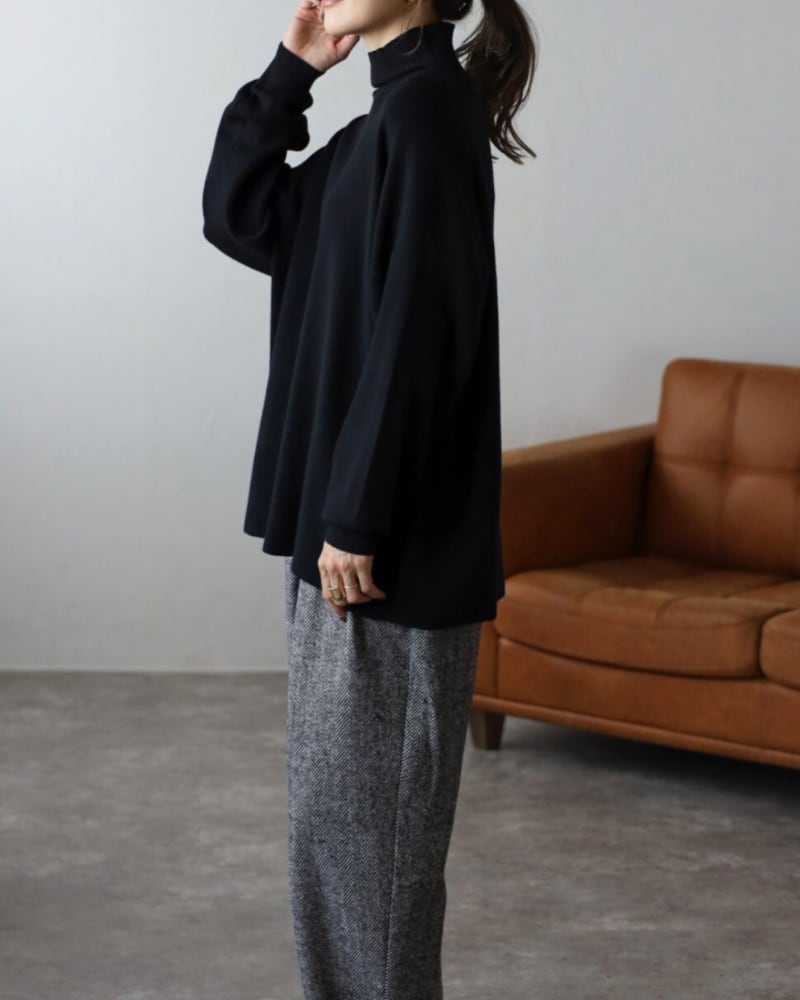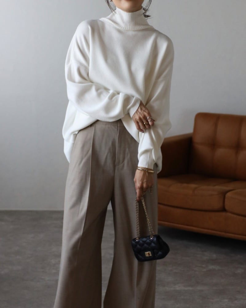 タートルネックは折り返さずにゆるっと着こなしていただくと、ニュアンス感が出ておしゃれ度がアップします。
