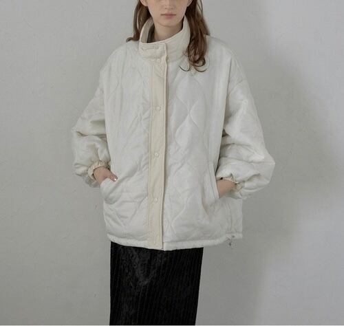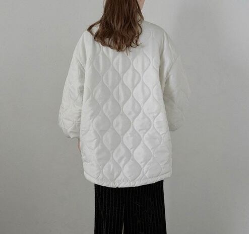 表面のキルティングステッチは保温性とデザイン性を兼ね備え、裏面はシンプルな無地でコーディネートの幅を広げます。